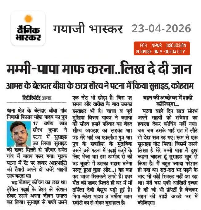 यह बेहद दुखद और चिंताजनक घटना है। जीवन में असफलता आना कोई असामान्य बात नहीं है—यह सफलता की यात्रा का हिस्सा है। आज के युवाओं को यह समझना बेहद जरूरी है कि आत्महत्या किसी समस्या का समाधान नहीं है, बल्कि यह एक स्थायी अंत है एक अस्थायी समस्या का।
