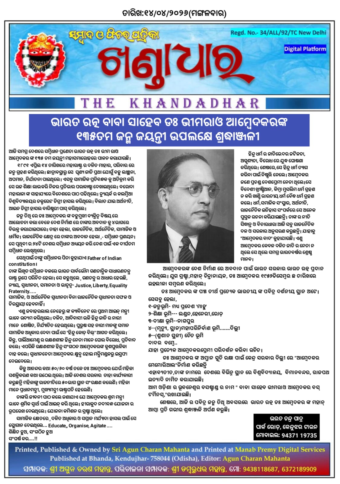 ଆଜି ସମଗ୍ର ଦେଶରେ ସମ୍ବିଧାନ ପ୍ରଣେତା ଭାରତ ରତ୍ନ ଡଃ ଭୀମ ରାଓ ଆମ୍ବେଦକର ଙ୍କ ୧୩୫ ତମ ଜୟନ୍ତୀ ମହାସମାରୋହରେ ପାଳନ କରାଯାଉଛି।