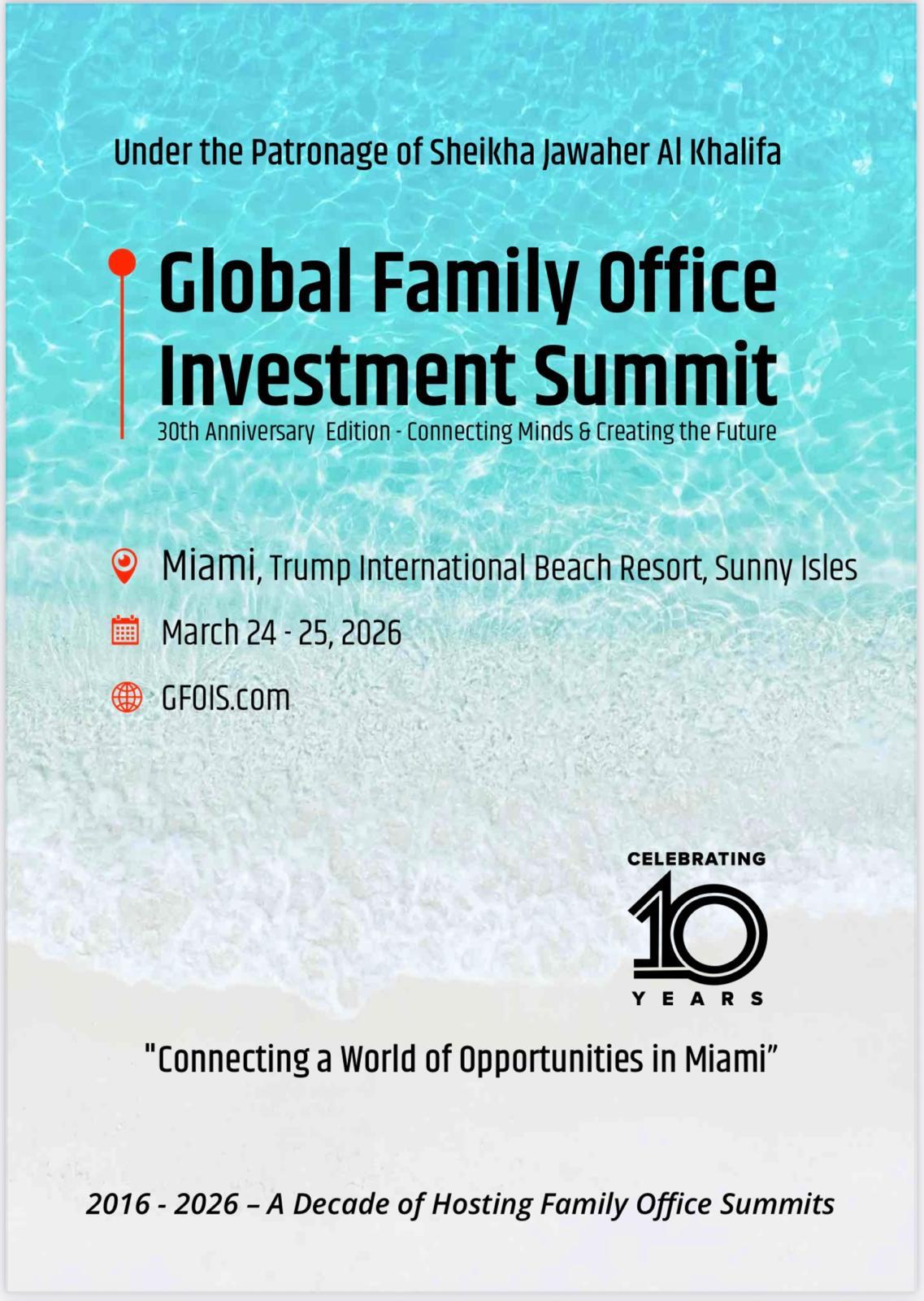 More than 300 international family office investors, visionary entrepreneurs, founders, and industry professionals will gather in Miami for the 30th Anniversary Edition of the Global Family Office Investment Summit. Led by Anthony Ritossa, GFOIS is also celebrating 10 years of building the global GFOIS community.