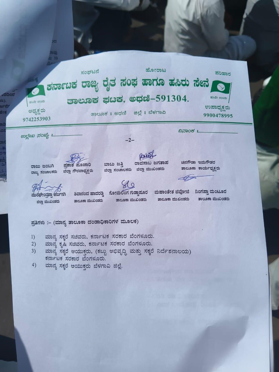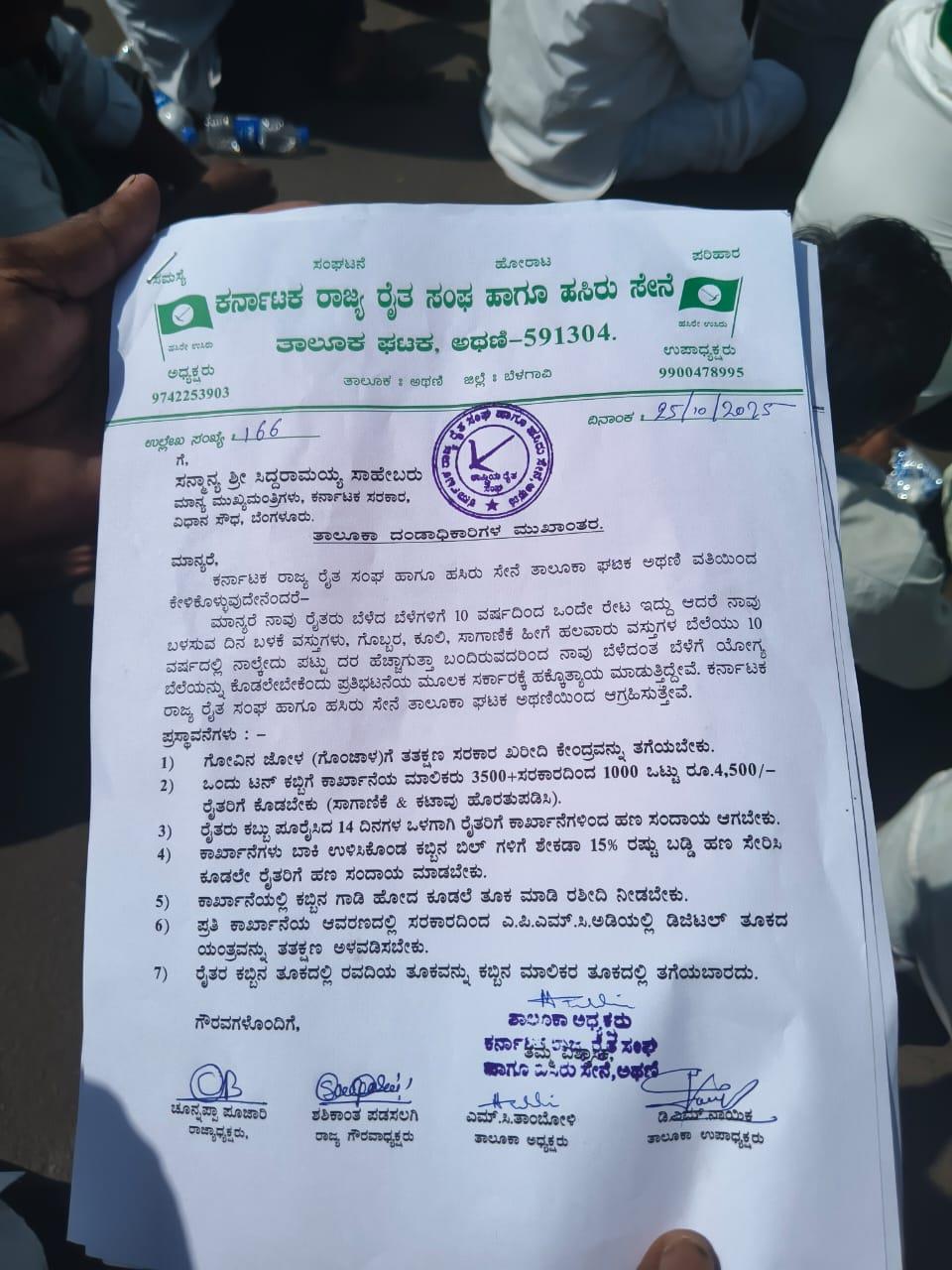 ಮಾನ್ಯರೆ ನಾವು ರೈತರು ಬೆಳೆದ ಬೆಳೆಗಳಿಗೆ 10 ವರ್ಷದಿಂದ ಒಂದೇ ರೇಟ ಇದ್ದು ಆದರೆ ನಾವು ಬಳಸುವ ದಿನ ಬಳಕೆ ವಸ್ತುಗಳು, ಗೊಬ್ಬರ, ಕೂಲಿ, ಸಾಗಾಣಿಕೆ ಹೀಗೆ ಹಲವಾರು ವಸ್ತುಗಳ ಬೆಲೆಯು 10 ವರ್ಷದಲ್ಲಿ ನಾಲೈದು ಪಟ್ಟು ದರ ಹೆಚ್ಚಾಗುತ್ತಾ ಬಂದಿರುವದರಿಂದ ನಾವು ಬೆಳೆದಂತ ಬೆಳೆಗೆ ಯೋಗ್ಯ ಬೆಲೆಯನ್ನು ಕೊಡಲೇಬೇಕೆಂದು ಪ್ರತಿಭಟನೆಯ ಮೂಲಕ ಸರ್ಕಾರಕ್ಕೆ ಹಕ್ಕೊತ್ಯಾಯ ಮಾಡುತ್ತಿದ್ದೇವೆ. ಕರ್ನಾಟಕ ರಾಜ್ಯ ರೈತ ಸಂಘ ಹಾಗೂ ಹಸಿರು ಸೇನೆ ತಾಲೂಕಾ ಘಟಕ ಅಥಣಿಯಿಂದ ಆಗ್ರಹಿಸುತ್ತೇವೆ.