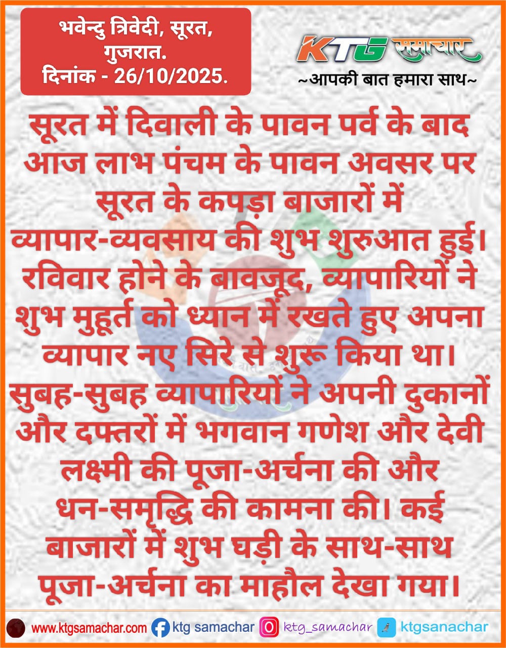 सूरत में दिवाली के पावन पर्व के बाद आज लाभ पंचम के पावन अवसर पर सूरत के व्यापारियों ने व्यापार शुरू किया।