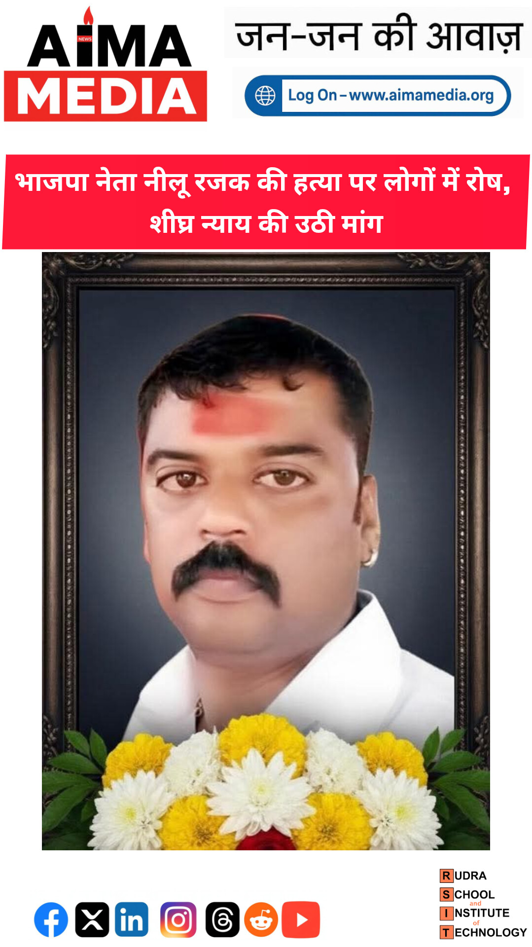 भारतीय जनता पार्टी पिछड़ा वर्ग मोर्चा के मंडल अध्यक्ष एवं बजरंग दल के पूर्व पदाधिकारी श्री (नीलू) रजक की हत्या की घटना ने पूरे क्षेत्र को स्तब्ध कर दिया है। नीलू रजक जी अपनी मिलनसार प्रवृत्ति, संगठन के प्रति निष्ठा और समाजसेवा के कार्यों के लिए जाने जाते थे।