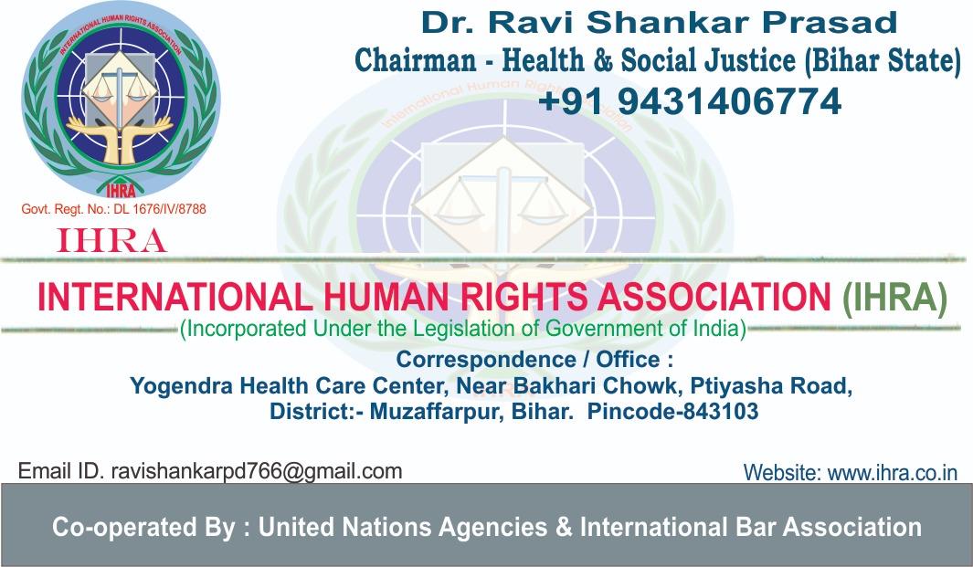 डॉ रविशंकर प्रसाद- जेनरल फिजिशियन मुजफ्फरपुर- को I. H. R. A.मानवाधिकार प्रदेश अध्यक्ष (बिहार) स्वास्थ्य विभाग एवं सामाजिक न्याय विभाग बनाया गया।...
