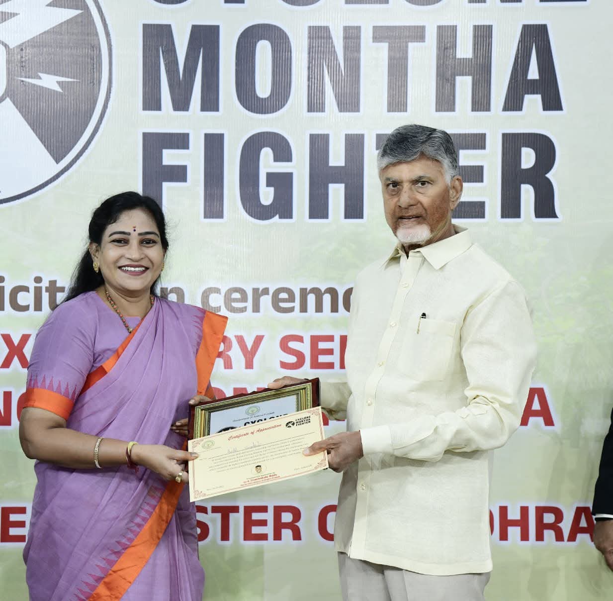 మీ శిష్యరికంలో ప్రజలకు సేవ చేయడం నేర్చుకున్నామని చెప్పారు. ప్రజల సమస్యలను తెలుసుకుని, వారికి ఎల్లప్పుడూ అందుబాటులో ఉండడం మా బాధ్యతగా భావిస్తున్నాం అని తెలిపారు. మీ చేతుల మీదుగా ‘సైక్లోన్ మొంథా ఫైటర్’ సర్టిఫికెట్ స్వీకరించడం, మీ నుంచి ప్రశంసలు అందుకోవడం నా జీవితంలో మర్చిపోలేని అనుభవమన్నారు. ముఖ్యమంత్రి గారి మార్గదర్శకంలోనే మొంథా తుఫాను సమయంలో ఒక్క ప్రాణం కూడా కోల్పోకుండా కాపాడగలిగాం అని అన్నారు. తుఫాను సమయంలో ప్రజలకు అండగా నిలిచిన ప్రతి ఒక్కరికి ఈ సందర్భంగా మంత్రి అనిత ధన్యవాదాలు తెలిపారు.