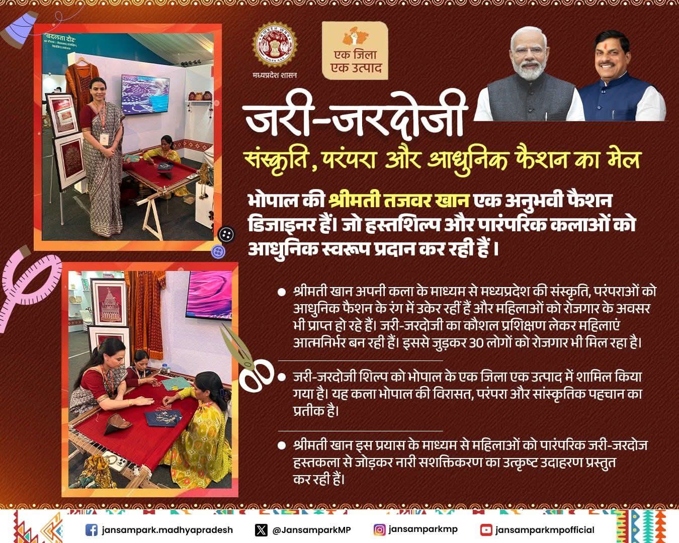 फैशन डिजाइनर श्रीमती तजवर खान जरी-जरदोजी की कला को मध्यप्रदेश की संस्कृति और परंपराओं को आधुनिक फैशन के रंग में उकेर रहीं हैं और महिलाओं को रोजगार के अवसर प्रदान कर रहीं हैं।