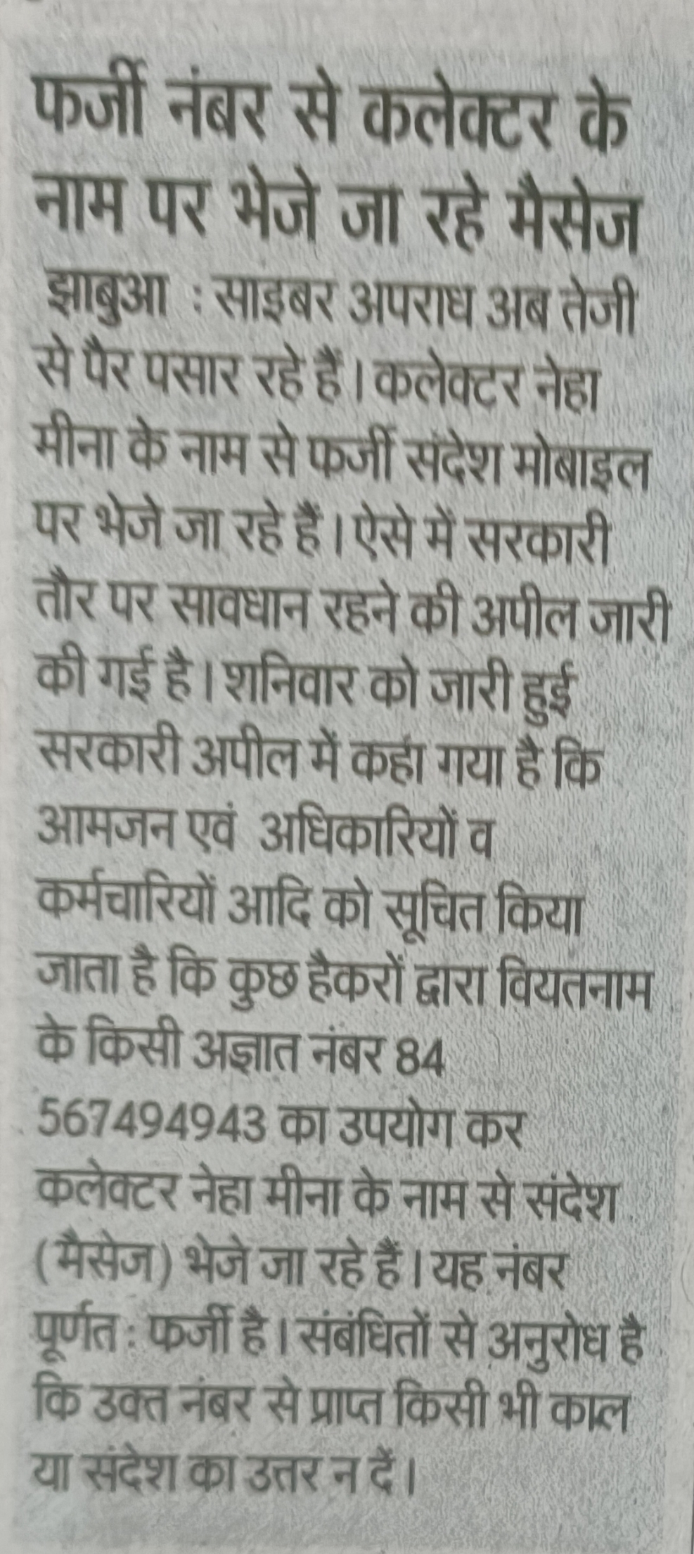 कलेक्टर धार का फोटो लगाकर धोकाधड़ी के बाद कलेक्टर झाबुआ नेहा मीना के नाम से फर्जी संदेश भेजे ।