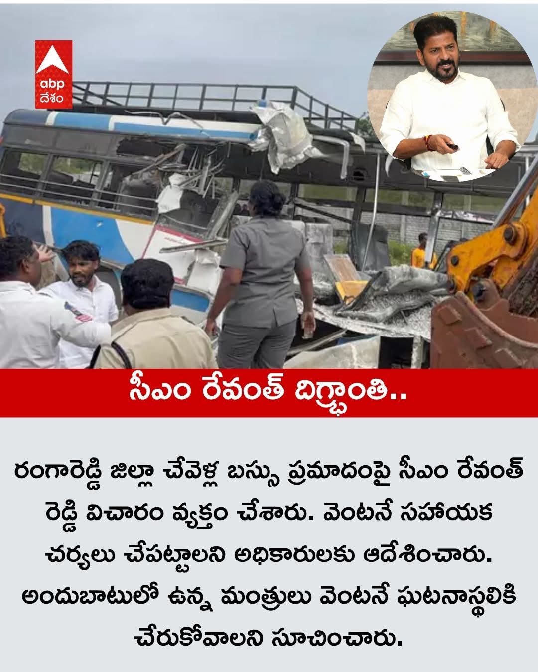 రంగారెడ్డి జిల్లా చేవెళ్ల బస్సు ప్రమాదంపై సీఎం రేవంత్ రెడ్డి విచారం వ్యక్తం చేశారు. అధికారులు వెంటనే అక్కడికి చేరుకొని, అవసరమైన సహాయక చర్యలు చేపట్టాలని సీఎం అధికారులను ఆదేశించారు. ప్రమాదానికి సంబంధించిన పూర్తి వివరాలు ఎప్పటికప్పుడు తెలియజేయాలన్నారు. అందుబాటులో ఉన్న మంత్రులు వెంటనే ఘటనాస్థలికి చేరుకోవాలని సూచించారు. సహాయక చర్యలను ముమ్మరం చేయాలని , అందుకు అవసరమైన అన్ని చర్యలు తీసుకోవాలని జిల్లా కలెక్టర్‌ను సీఎం ఆదేశించారు. తాండూరు డిపోనకు చెందిన ఆర్టీసీ బస్సును కంకర లోడుతో వెళ్తున్న లారీ ఢీకొట్టింది. చేవెళ్ల మండలం మీర్జాగూడ సమీపంలో ఈ ఘటన చోటుచేసుకుంది. బస్సుపై కంకర లోడు పడిపోవడంతో పలువురు ప్రయాణికులు దానికింద కూరుకుపోయారు. ఈ ప్రమాదంలో 20 మంది మృతి చెందగా.. పలువురు తీవ్రంగా గాయడ్డారు. మృతుల్లో 10 మంది పురుషులు, 9 మంది మహిళలు, ఒక చిన్నారి ఉన్నారు.