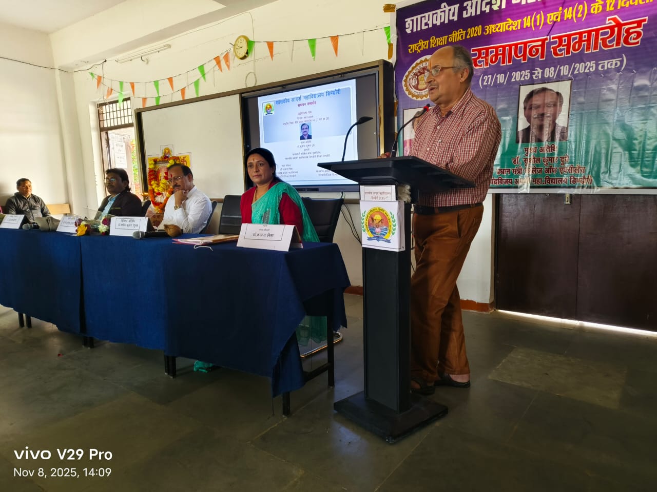 डिंडौरी -- मध्य प्रदेश उच्च शिक्षा विभाग, भोपाल के आदेशानुसार शासकीय आदर्श महाविद्यालय डिंडौरी में 27 अक्टूबर 2025 से 8 नवम्बर 2025 तक राष्ट्रीय शिक्षा नीति पर 12 दिवसीय प्रशिक्षण कार्यक्रम का सफलतापूर्वक आयोजन किया गया।इस प्रशिक्षण कार्यक्रम के अंतर्गत छात्रों को अध्यादेश 14(1) और 14 (2) से संबंधित विषयों की विस्तृत जानकारी प्रदान की गई। प्रतिदिन प्रातः 11 से 12 बजे तक डॉ. कल्पना मिश्रा द्वारा प्रशिक्षण सत्र संचालित किया गया, जिनके मार्गदर्शन में छात्रों को नई शिक्षा नीति के उद्देश्य, संरचना एवं महत्व से अवगत कराया गया। साथ ही विज्ञान विभाग के तरुण राठौर ने भी पावर पॉइंट प्रस्तुति के माध्यम से प्रशिक्षण में सक्रिय सहयोग प्रदान किया।