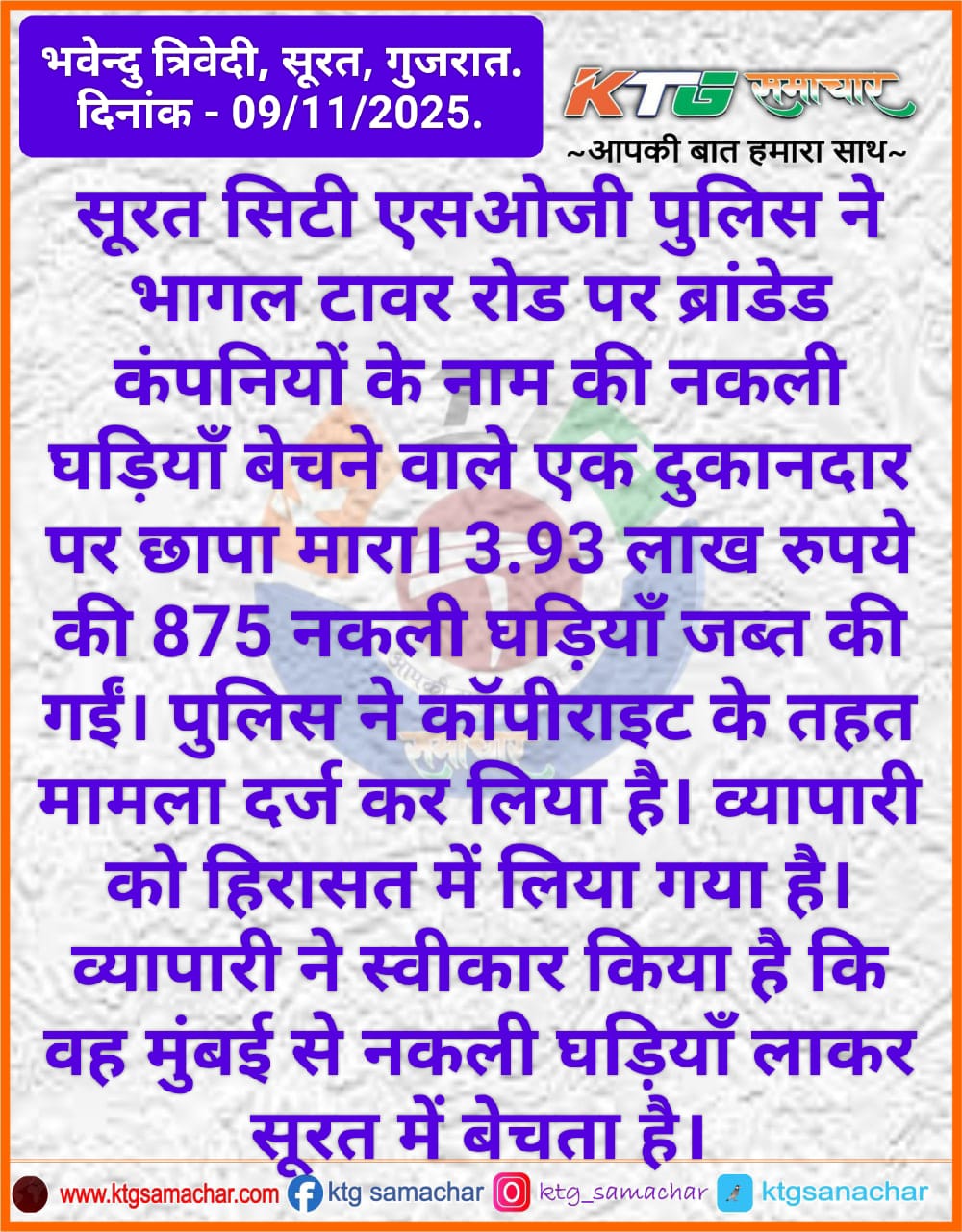 सूरत सिटी एसओजी पुलिस ने भागल टावर रोड पर ब्रांडेड कंपनियों के नाम की नकली घड़िया बेचने वाले एक दुकानदार पर छापा मारा।