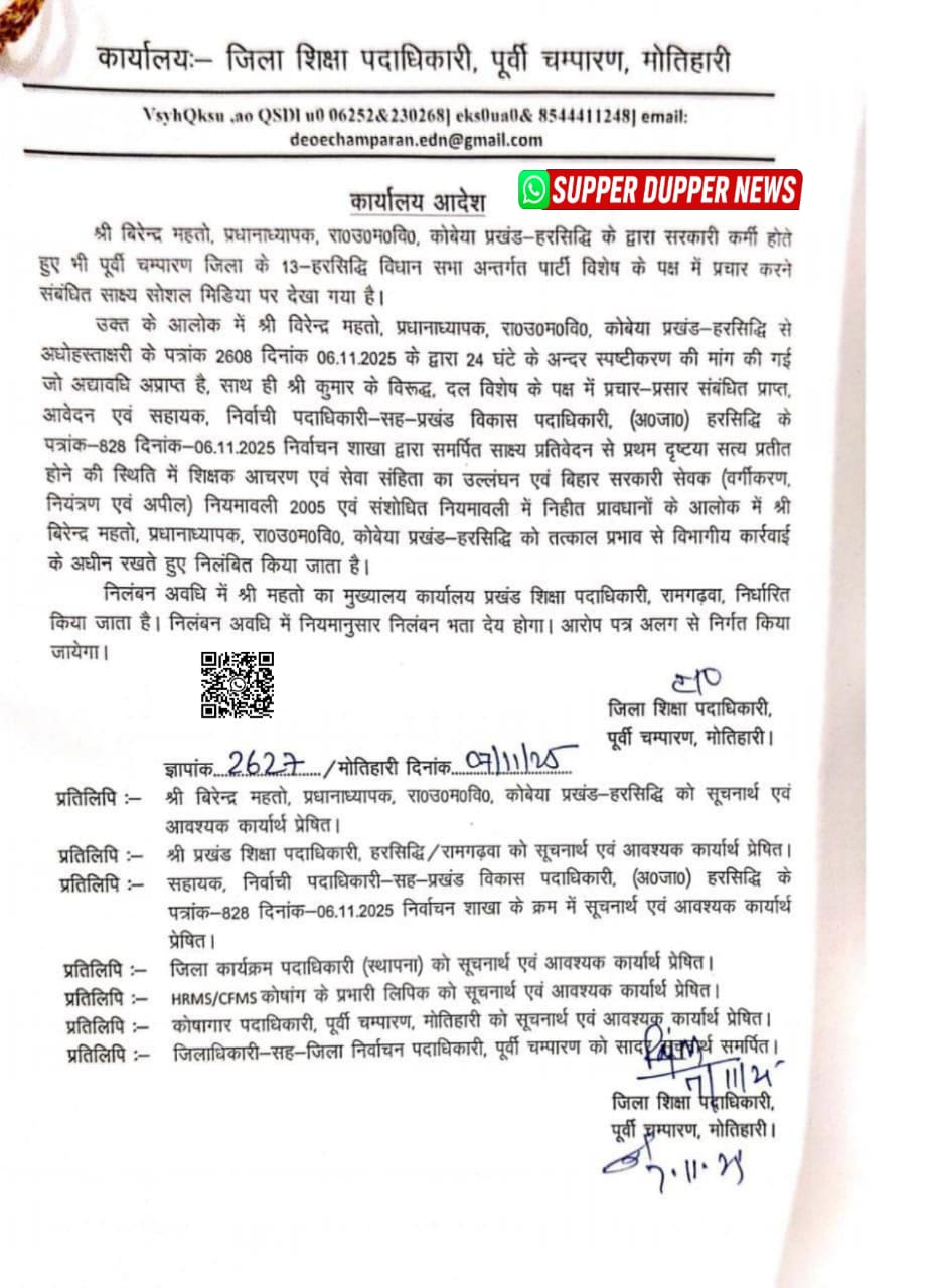 *"राजकीय मध्य विद्यालय कोबया, हरसिद्धि जिला मोतिहारी के प्रधानाध्यापक बीरेंद्र महतो को स्कूल की जिम्मेदारी छोड़कर राजनीतिक दल के कार्यक्रम में ढोल-नगाड़े और जयकारों के बीच पाया गया। यही उत्साह जब वीडियो बनकर सोशल मीडिया पर तैर गया, तो शिक्षा विभाग की नज़र पड़ते ही मामला तूल पकड़ गया।" विभागीय जांच में मामला सत्य पाते हुए उक्त शिक्षक को तत्काल प्रभाव से निलंबित कर दिया गया है*