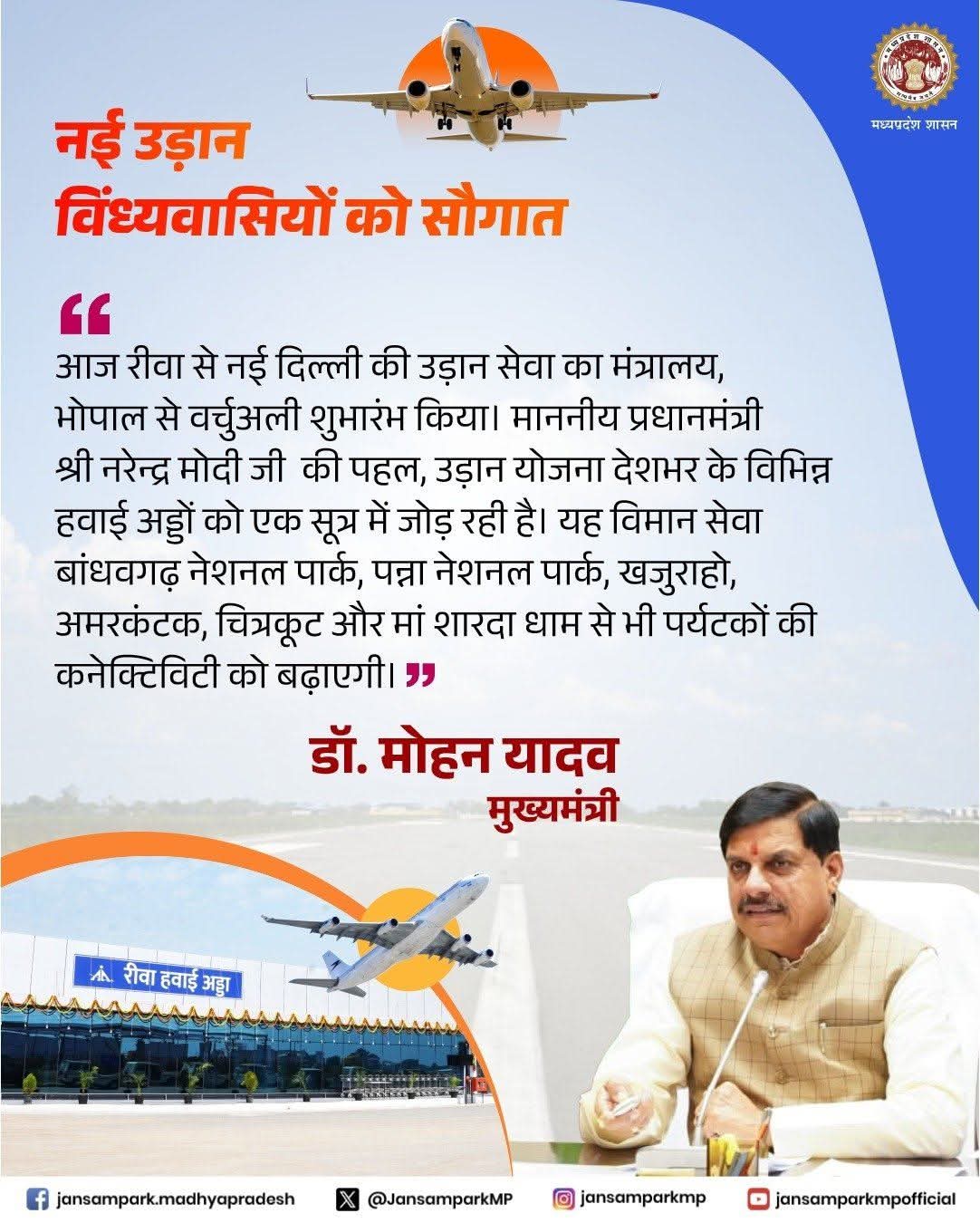 आज रीवा से नई दिल्ली की उड़ान सेवा का मंत्रालय, भोपाल से वर्चुअली शुभारंभ किया। माननीय प्रधानमंत्री श्री नरेन्द्र मोदी जी की पहल, उड़ान योजना देशभर के विभिन्न हवाई अड्डों को एक सूत्र में जोड़ रही है। यह विमान सेवा बांधवगढ़ नेशनल पार्क, पन्ना नेशनल पार्क, खजुराहो और अमरकंटक, चित्रकूट और मां शारदा धाम से भी पर्यटकों की कनेक्टिविटी को बढ़ाएगी।