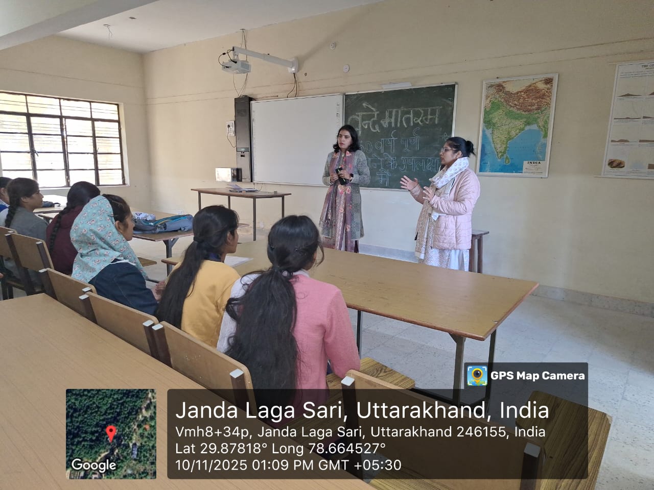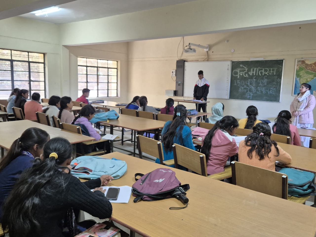 कार्यक्रम की शुरुआत महाविद्यालय की राजनीति विज्ञान की प्राध्यापिका डॉ. वंदना ध्यानी बहुगुणा द्वारा वंदे मातरम के इतिहास, उसकी रचना की पृष्ठभूमि तथा स्वतंत्रता आंदोलन में इसके अमिट योगदान पर एक विस्तृत व्याख्यान से हुई। उन्होंने कहा कि वंदे मातरम केवल एक गीत नहीं बल्कि भारत की आत्मा का प्रतीक है, जिसने स्वतंत्रता संग्राम के दौरान देशवासियों में नई ऊर्जा और एकता का संचार किया।