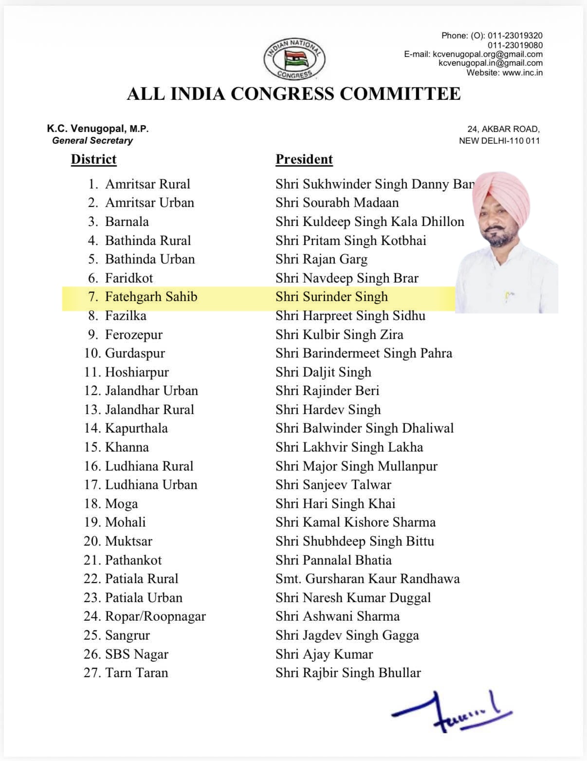 फतेहगढ़ साहिब, Kalia कांग्रेस पार्टी हाईकमान ने सुरिंदर सिंह रामगढ़ को फतेहगढ़ साहिब जिले का नया जिला अध्यक्ष नियुक्त किया है। पार्टी ने यह फैसला उनकी संगठन के प्रति लंबे समय से चली आ रही सेवाओं और समर्पण को देखते हुए लिया है।