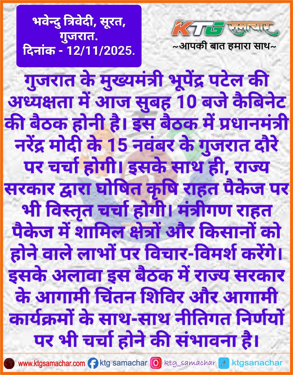 गुजरात के मुख्यमंत्री भूपेंद्र पटेल की अध्यक्षता में आज सुबह 10 बजे कैबिनेट की बैठक होनी है।