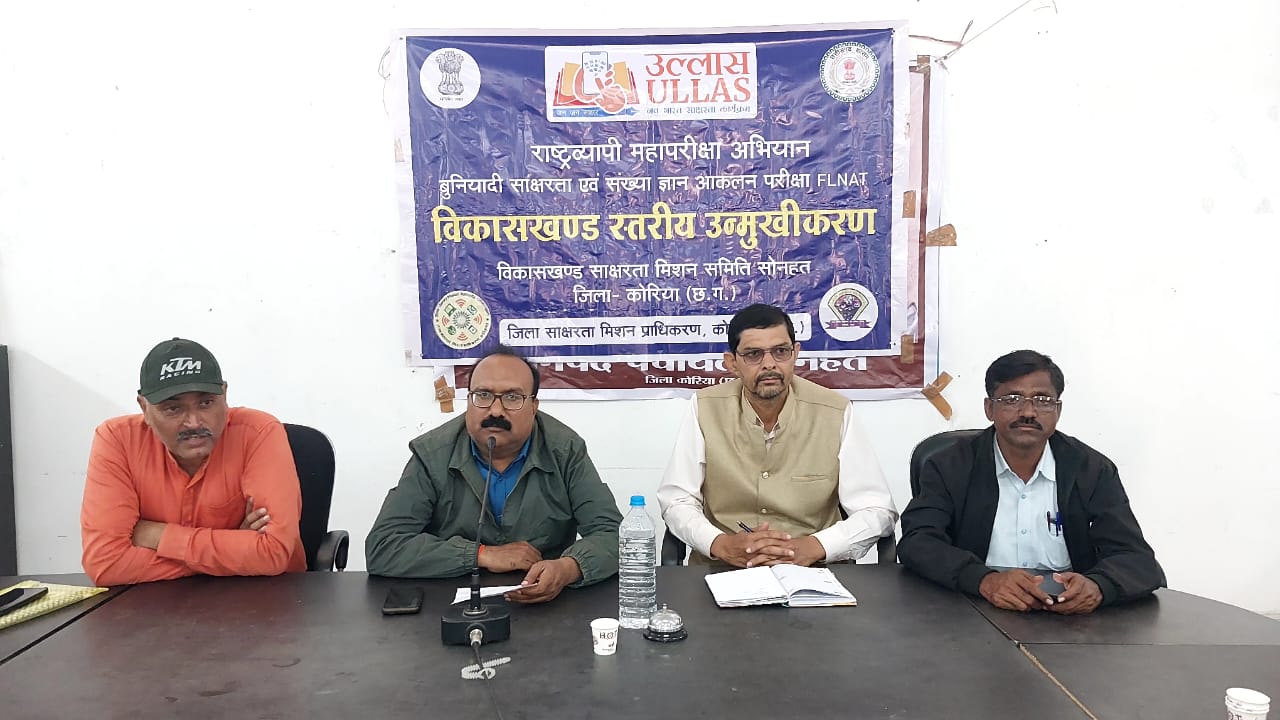 सोनहत 13 नवम्बर 2025 उल्लास नवभारत साक्षरता कार्यक्रम के तहत राष्ट्रव्यापी महापरीक्षा अभियान 7 दिसंबर 2025 को होने जा रहा है। इस अभियान की तैयारियों को लेकर मुख्य कार्यपालन अधिकारी एवं अध्यक्ष विकासखण्ड साक्षरता मिशन समिति सोनहत की अध्यक्षता में जनपद सभा कक्ष में समीक्षा बैठक एवं कार्यशाला आयोजित की गई। बैठक में जिला परियोजना अधिकारी ,जिला साक्षरता मिशन प्राधिकरण कोरिया, विकास खंड शिक्षा अधिकारी सोनहत, सहित समस्त संकुल पाचार्य/समस्त संकुल शैक्षिक समन्वयक उपस्थित रहे।