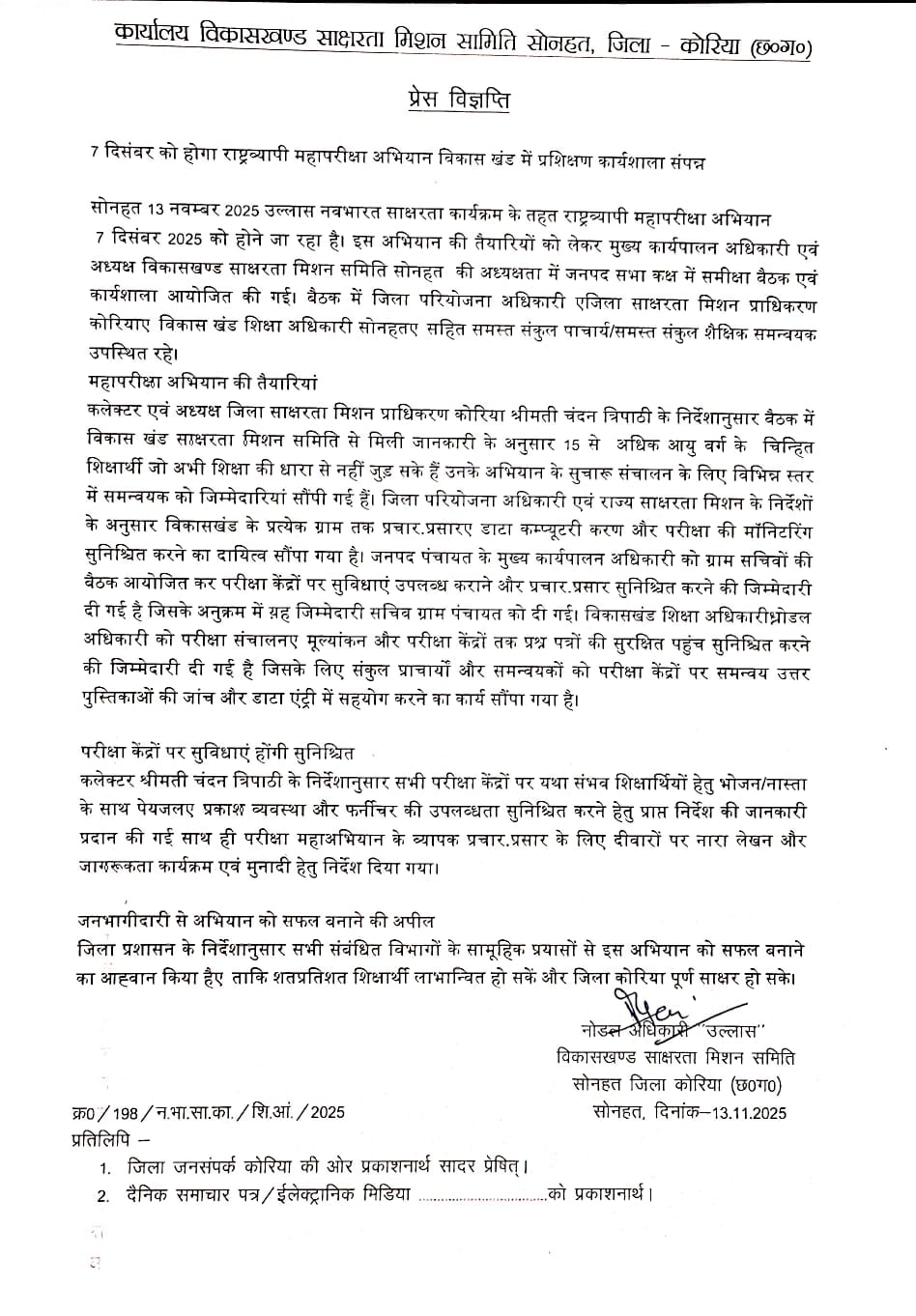 जिला प्रशासन के निर्देशानुसार सभी संबंधित विभागों के सामूहिक प्रयासों से इस अभियान को सफल बनाने का आह्वान किया है, ताकि शतप्रतिशत शिक्षार्थी लाभान्वित हो सकें और जिला कोरिया पूर्ण साक्षर हो सके।