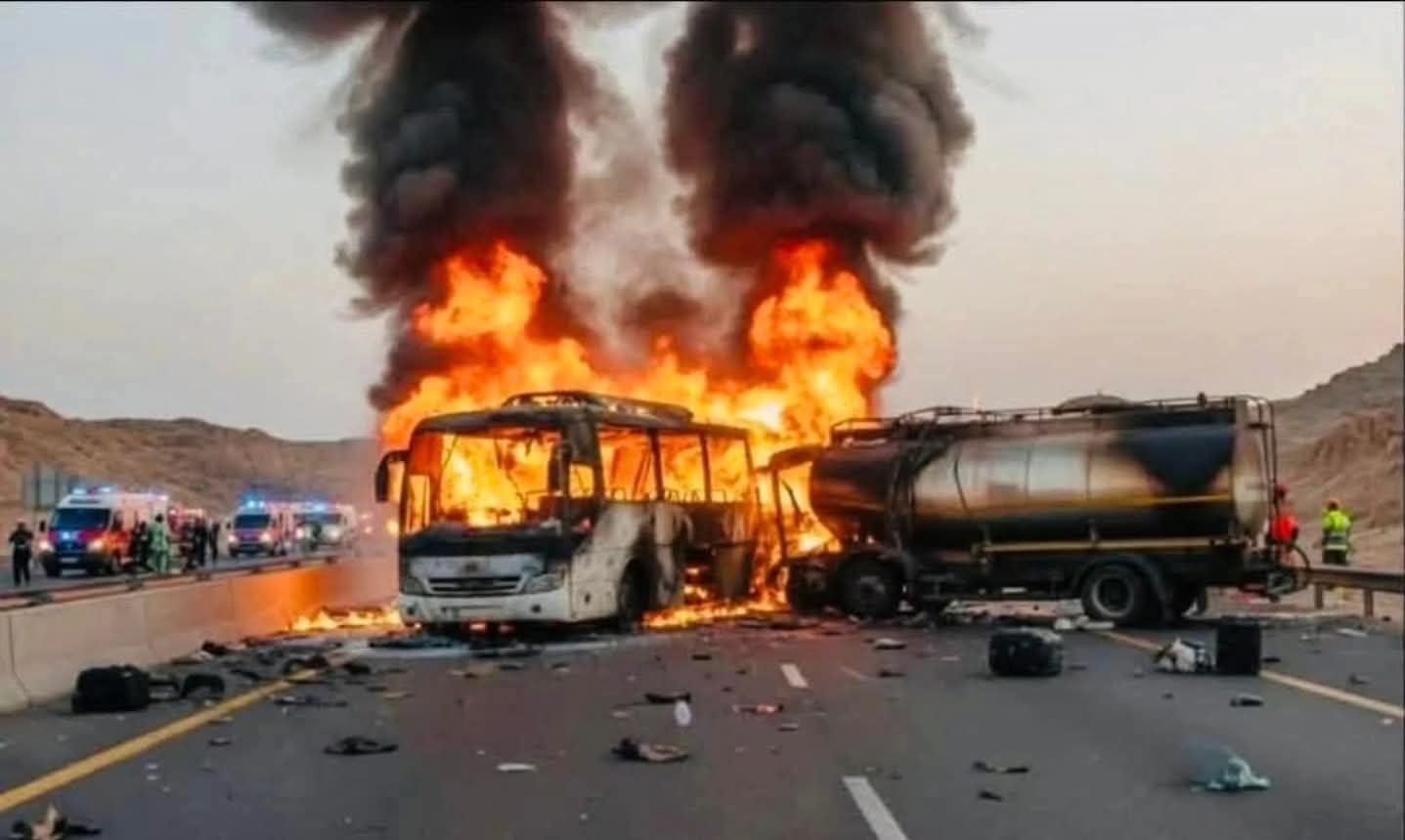 మక్కా నుండి మదీనాకు ప్రయాణిస్తుండగా డీజిల్ ట్యాంకర్ను ఢీకొట్టిన బస్సు ట్యాంకర్ నుండి మంటలు చెలరేగి బస్సుకు అంటుకొని యాత్రికులు సజీవదహనం...