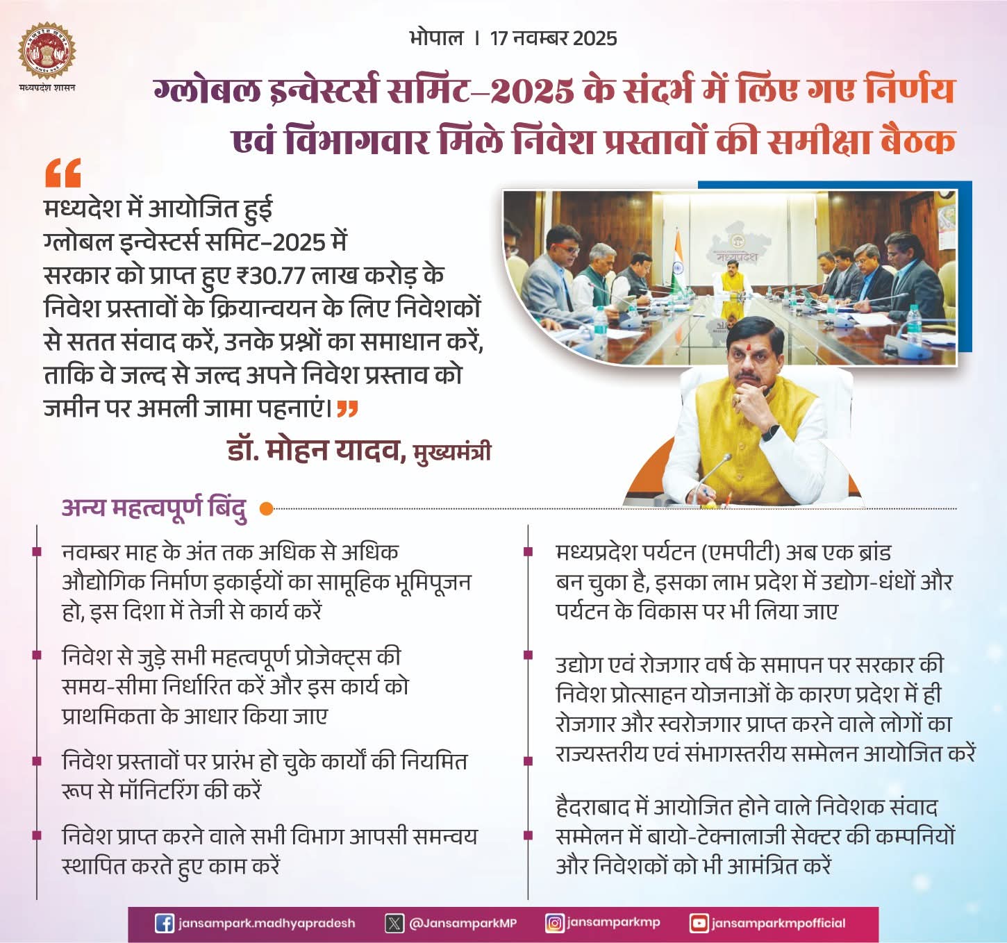 ग्लोबल इन्वेस्टर्स समिट–2025 के संदर्भ में लिए गए निर्णयों एवं विभागवार मिले निवेश प्रस्तावों की समीक्षा बैठक