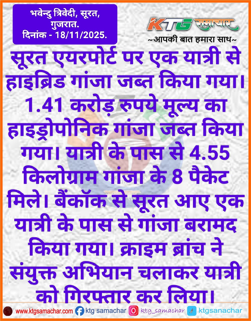 सूरत एयरपोर्ट पर एक यात्री से हाइब्रिड गांजा जब्त किया गया।