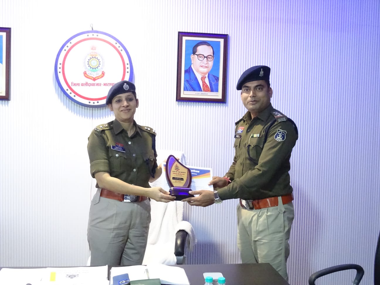 बलौदाबाजार। जिले में अपराध नियंत्रण और संगीन मामलों की त्वरित जांच में उत्कृष्ट प्रदर्शन पर थाना प्रभारी पलारी निरीक्षक हेमंत पटेल को COP OF THE MONTH के सम्मान से नवाजा गया। पुलिस अधीक्षक श्रीमती भावना गुप्ता ने उन्हें और उनकी टीम के कुल 7 अधिकारियों-कर्मचारियों को प्रशस्ति पत्र एवं प्रतीक चिन्ह प्रदान कर सम्मानित किया।