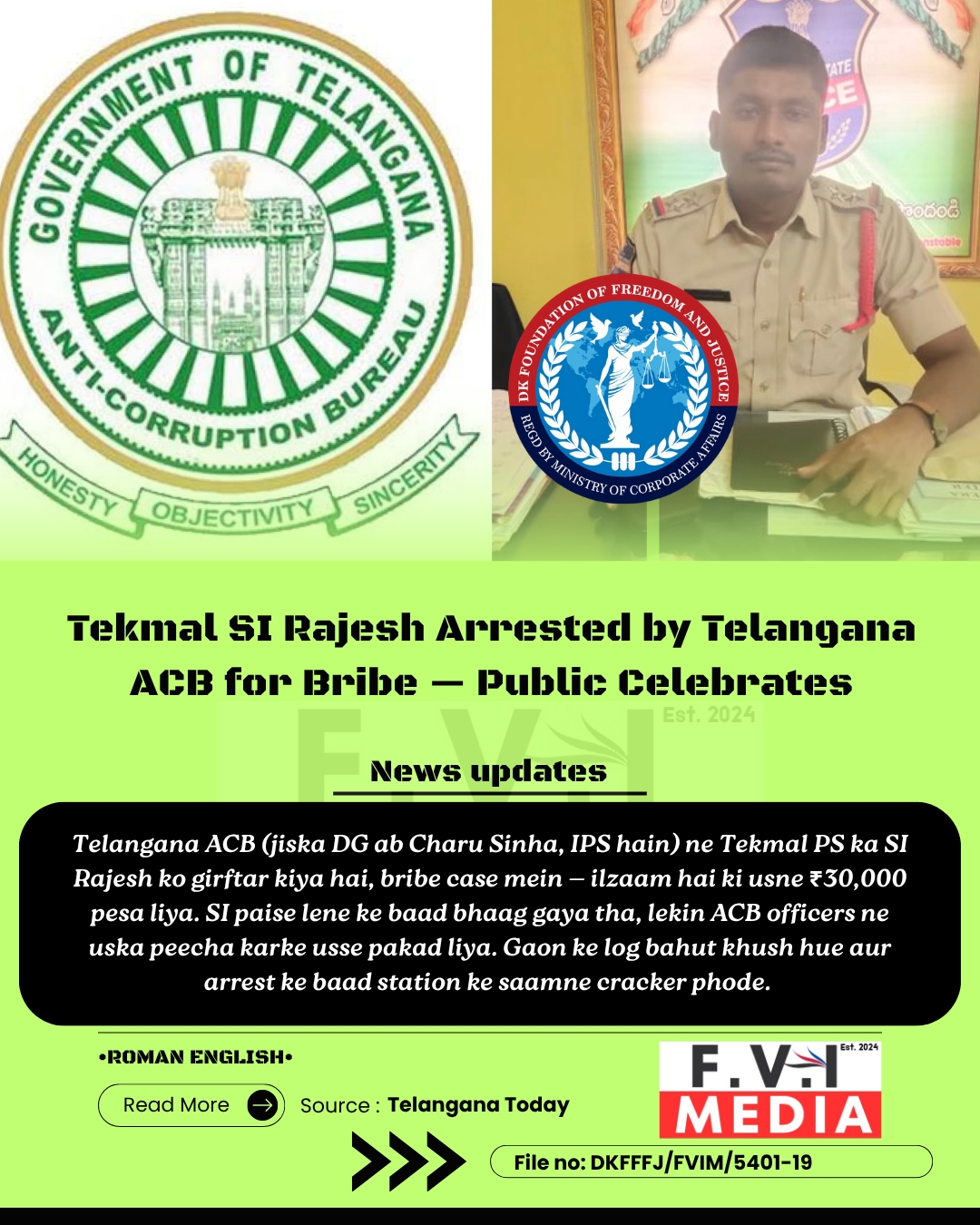 Telangana’s Anti-Corruption Bureau (ACB), under the leadership of DG Charu Sinha, IPS, has arrested Sub-Inspector Rajesh of Tekmal (Medak district) for allegedly accepting a ₹30,000 bribe. The SI was caught red-handed while collecting money, but tried to flee into agricultural fields before being chased down by ACB officers. Locals, who have long complained about corruption, gathered in large numbers at the police station and burst firecrackers in celebration after his arrest.
