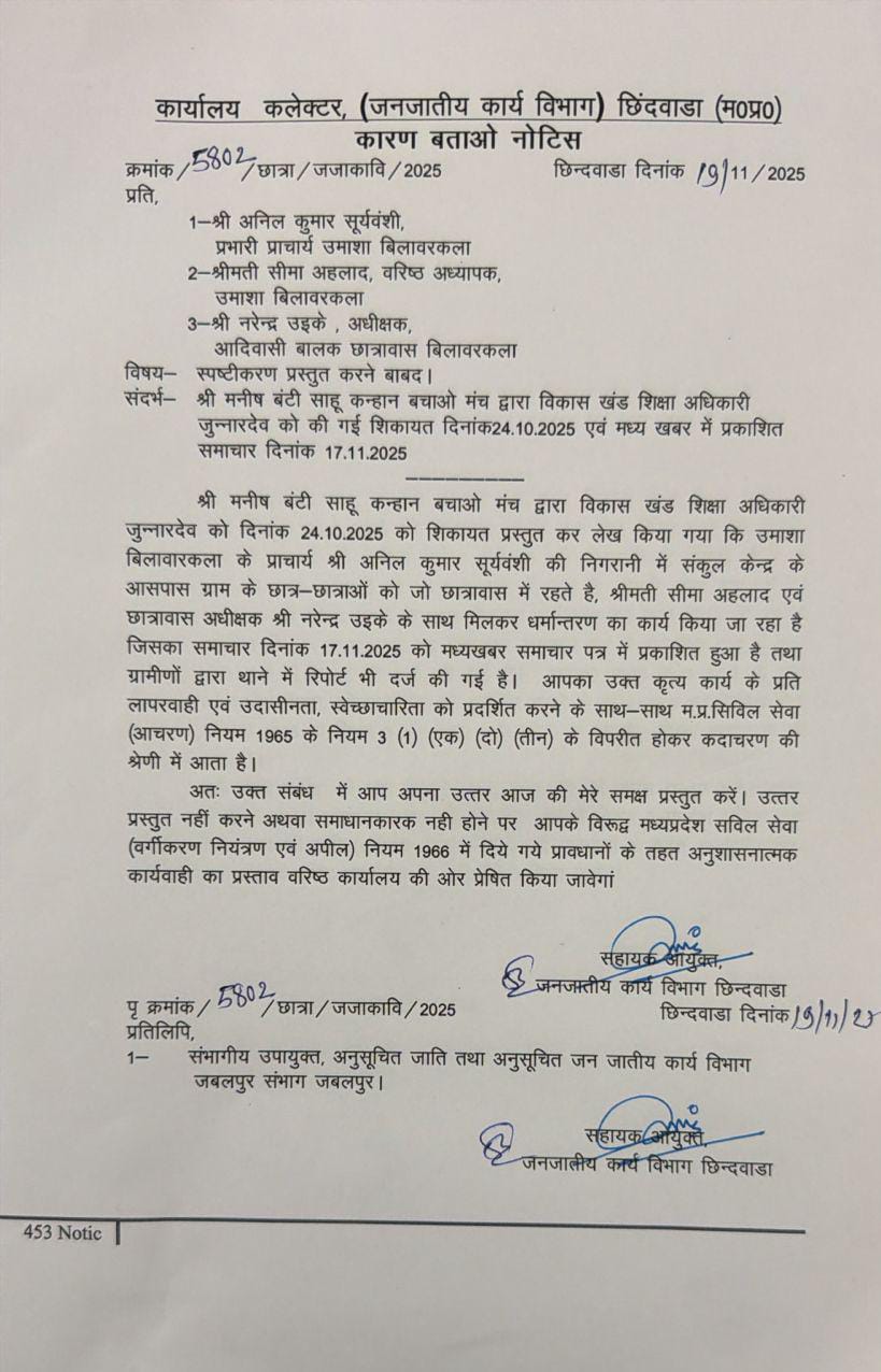जुन्नारदेव विकासखंड मुख्यालय से लगभग 10 किलोमीटर दूर स्थित उच्चतर माध्यमिक विद्यालय, बिलावर कला में धर्मांतरण के संवेदनशील मामले में जिला प्रशासन ने बड़ी कार्रवाई कर दी है। यहां मिली जानकारी के अनुसार कार्यालय कलेक्टर (जनजातीय कार्य विभाग शाखा), जिला छिंदवाड़ा के पत्र क्रमांक 5800 के अनुसार धर्मांतरण के मामले में मिली शिकायत के अनुसार यहां पदस्थ शिक्षिका, छात्रावास अधीक्षक एवं प्राचार्य को तत्काल रूप से हटा दिया गया है। इस मामले में पत्र में बताया गया है कि मध्य खबर अखबार में प्रकाशित तथा कन्हान बचाओ मंच के अध्यक्ष मनीष बंटी साहू के द्वारा यहां पदस्थ *शिक्षिका सीमा आह्लाद, एवं अधीक्षक नरेंद्र उईके* के साथ मिलकर धर्मांतरण का कार्य कथित तौर पर किया जाता है। इसमें इस विद्यालय के प्राचार्य *अनिल सूर्यवंशी* के द्वारा उन्हें संरक्षण दिया जाता रहा है। इस मामले में आरोपी शिक्षिका सीमा आह्लाद एवं छात्रावास अधीक्षक नरेंद्र उईके को बीईओ कार्यालय अटैच किया गया है जबकि प्रभारी प्राचार्य अनिल सूर्यवंशी को उच्चतर माध्यमिक विद्यालय खिड़की कनेरी में पदस्थापित किया गया है। इसी मामले में इसी विद्यालय के अध्यनरत दो आदिवासी छात्रों के द्वारा भी जिला कलेक्टर एवं स्थानीय पुलिस थाने में पहुंचकर इस संदर्भ में सूचना दी गई थी। कि उन्हें संबंधित यह तीनों शिक्षिक एवं शिक्षिका ईसाई धर्म को ग्रहण किए जाने के लिए दबाव डाल रहे हैं। इसके बाद यह मुद्दा जमकर चर्चा में आ चुका था। यही कारण रहा कि इस मामले में जिला प्रशासन के द्वारा सजगता से मामले की प्रारंभिक जांच की गई, जिसके आधार पर इन तीनों ही कर्मचारी व अधिकारी को यहां से हटाकर अन्यत्र स्थान पर पदस्थ किया गया है ताकि जांच किसी भी रूप में प्रभावित न हो सके। इधर *बीईओ ओपी जोशी* ने बताया कि इस मामले में वरिष्ठ अधिकारियों के मार्गदर्शन में मामले की निष्पक्ष जांच कर विभाग को प्रतिवेदन भेजा जाएगा।