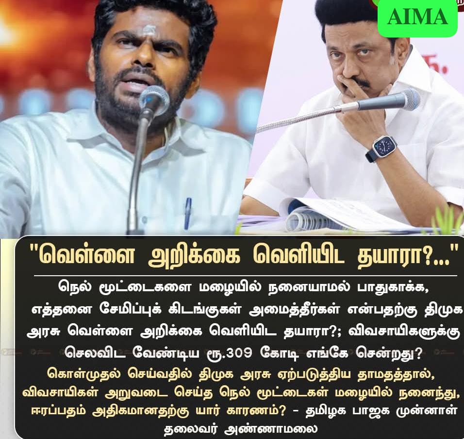 நெல்மூட்டைகளை. மழையில் நனைய விடாமல் பாதுகாக்க எத்தனை பாதுகாப்பு கிடங்கு அமைத்தீர்கள் என வெள்ளை அறிக்கை விட தயாரா விவசாயிகளுக்கு செலவிட வேண்டிய ரூபாய் 309 கோடி எங்கே போனது எனவும் கேள்வி கேட்டார் அண்ணாமலை