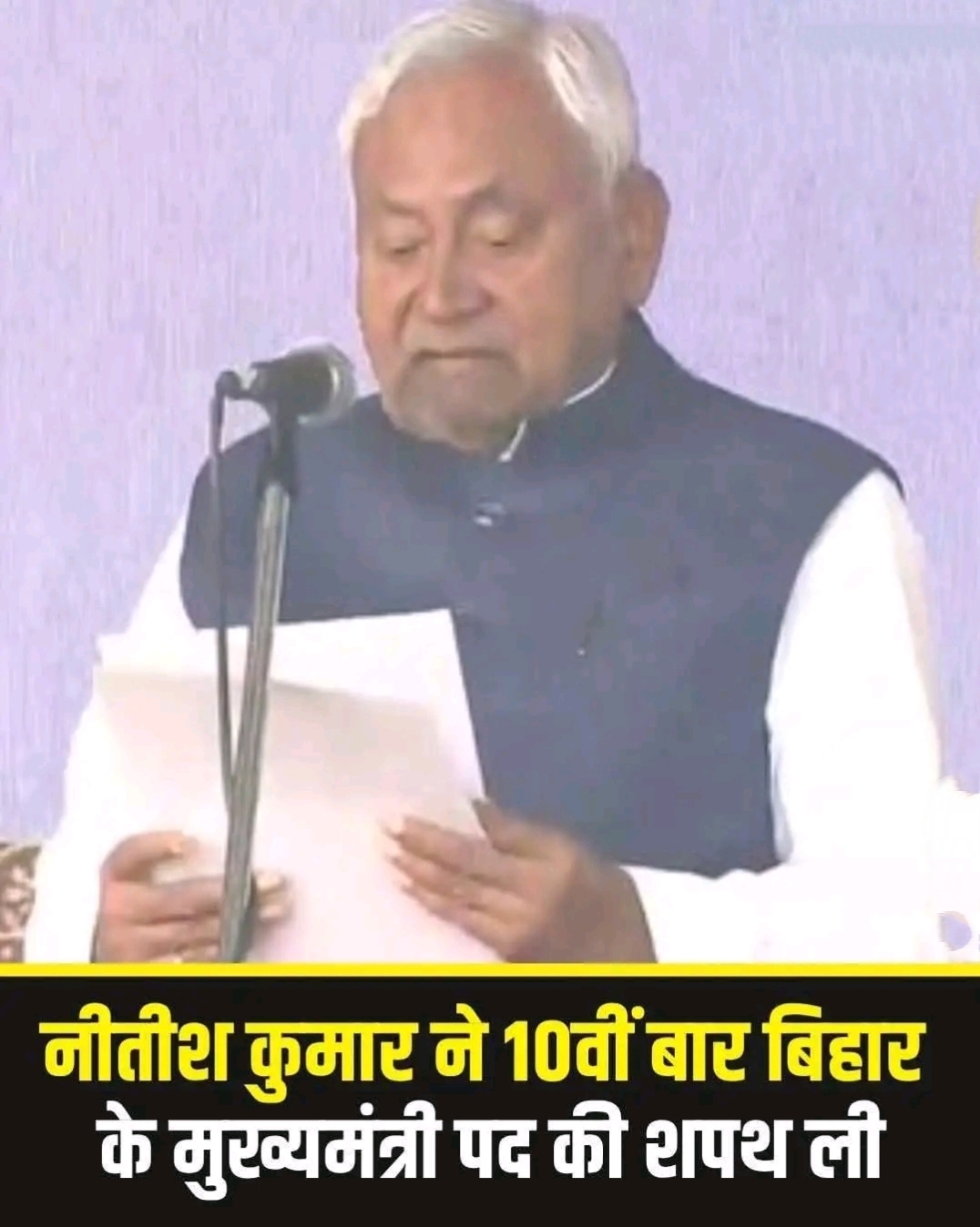 इस तस्वीर में एक वरिष्ठ नेता शपथ ग्रहण समारोह के दौरान संविधान की प्रति पढ़ते हुए नज़र आ रहे हैं। मंच पर माइक लगा है और वे औपचारिक तरीके से पद की शपथ लेते दिख रहे हैं। नीचे दी गई हेडलाइन में बताया गया है कि यह बिहार के मुख्यमंत्री पद से जुड़ा शपथ ग्रहण समारोह है, जिसमें उन्हें 10वीं बार पद ग्रहण करते हुए दिखाया गया है।