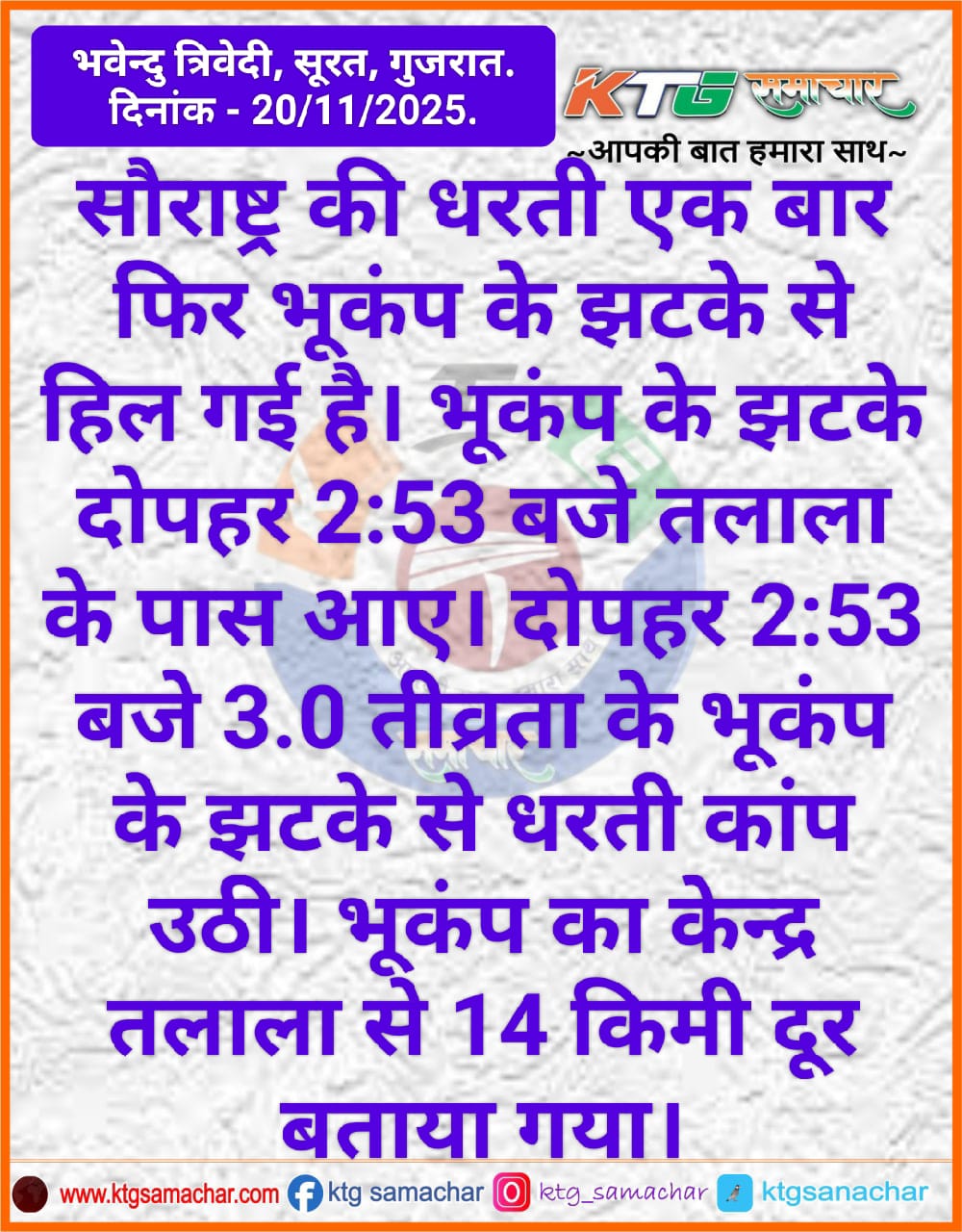 तलाला के पास दोहपर भूकंप के झटके महसूस किए गए।