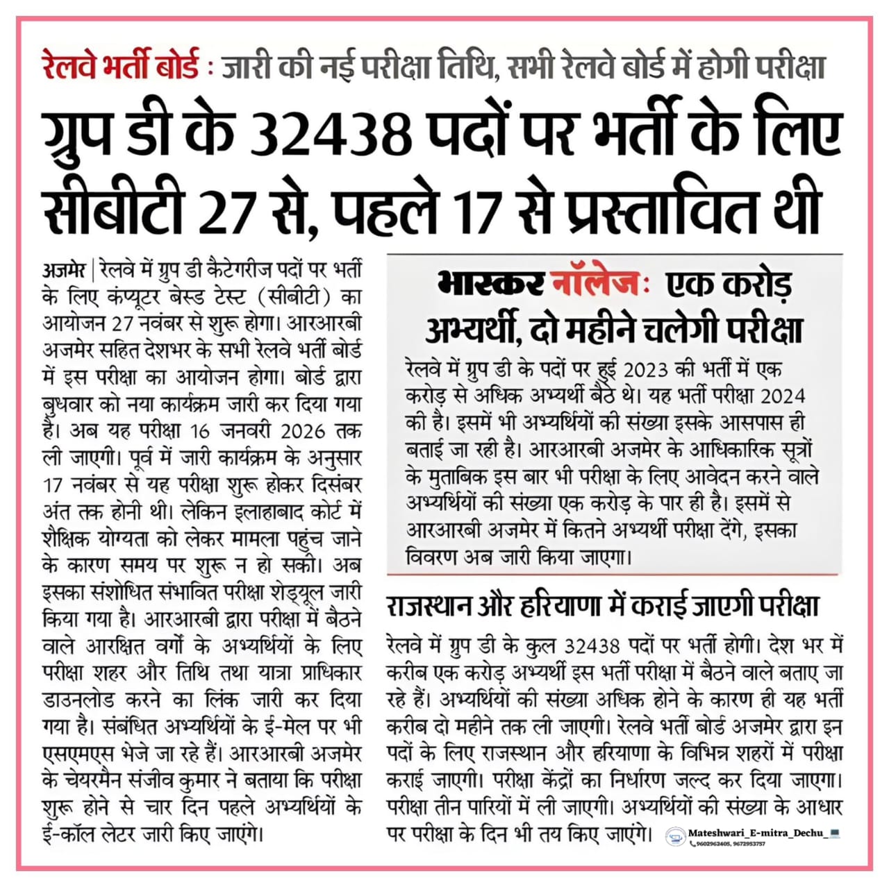 *रेलवे भर्ती बोर्ड : ग्रुप डी के 32438 पदों पर भर्ती के लिए सीबीटी 27 से , जारी की नई परीक्षा तिथि, सभी रेलवे बोर्ड में होगी परीक्षा पहले 17 से प्रस्तावित थी 📚✅*