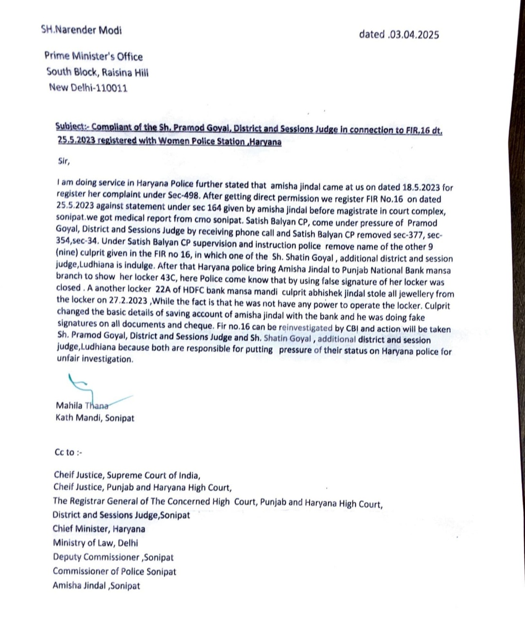 Subject:- Compliant against Sh. Parmod Goyal, The District Session Judge, Palwal ,Haryana puts pressure on CP Satish Balyan, Sonipat ,Haryana in for FIR No.16 dated 25.05.2023.
