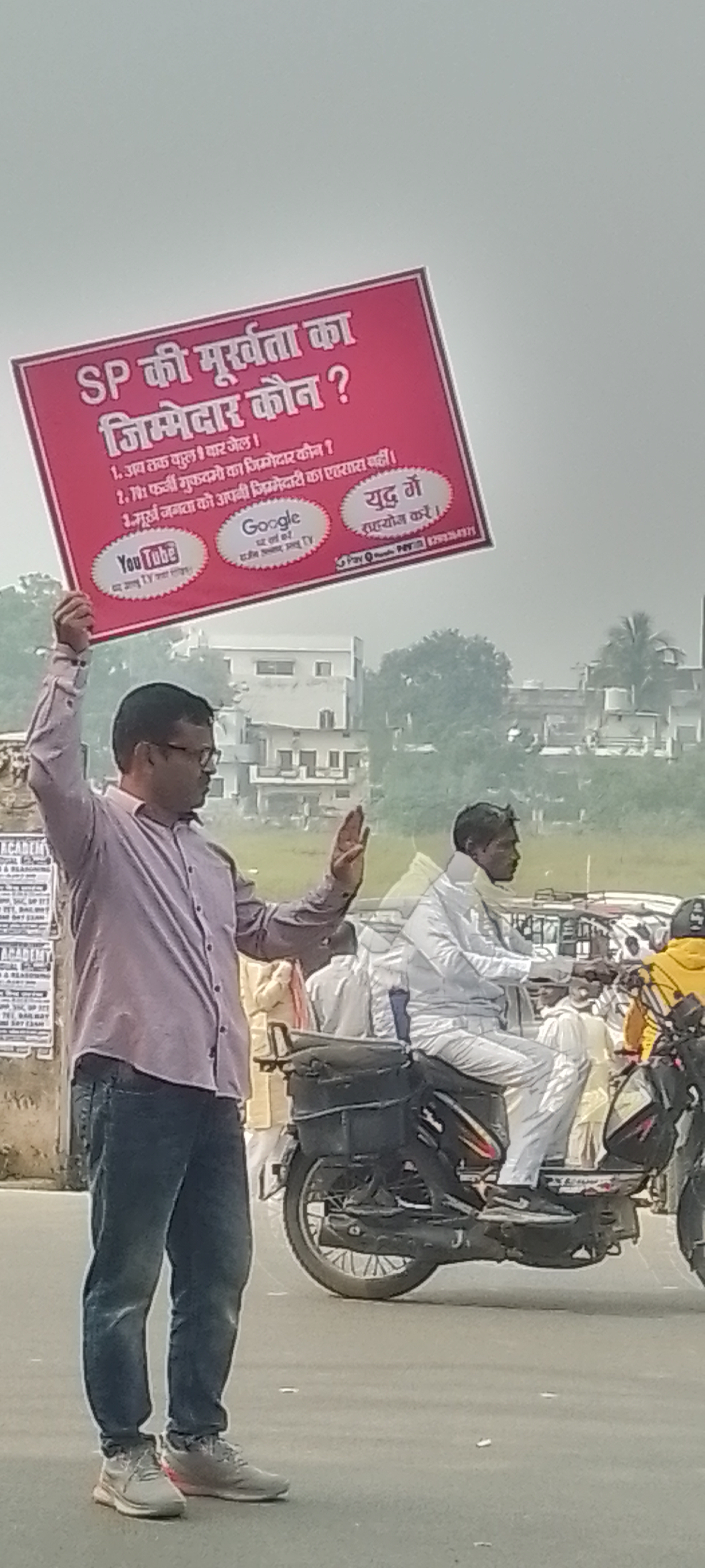 आजमगढ़ दीवानी चौराहे पर sp की मूर्खता का जिम्मेदार कौन का बैनर हाथ में लेकर बीच सड़क पर वाहन चालकों को परेशानी में डालकर खुद की मूर्खता का प्रमाण देता हुआ नज़र आया।