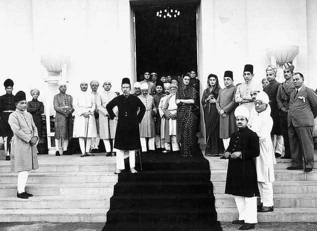 His Exalted Highness the Nizam, who declared open the Hyderabad Industrial Exhibition on February 22, 1940, is seen along with the Princes, Princesses and other staff after the opening ceremony on the footsteps of the newly constructed Exhibition Hall