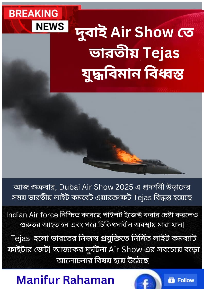 āφāϜ āĻļ⧁āĻ•ā§āϰāĻŦāĻžāϰ, Dubai Air Show 2025-āĻ āĻĒā§āϰāĻĻāĻ°ā§āĻļāύ⧀ āĻ‰ā§œāĻžāύ⧇āϰ āϏāĻŽā§Ÿ āĻ­āĻžāϰāĻ¤ā§€ā§Ÿ āϞāĻžāχāϟ āĻ•āĻŽāĻŦā§āϝāĻžāϟ āĻā§ŸāĻžāϰāĻ•ā§āϰāĻžāĻĢāϟ Tejas āĻŦāĻŋāĻ§ā§āĻŦāĻ¸ā§āϤ āĻšā§Ÿā§‡āϛ⧇āĨ¤