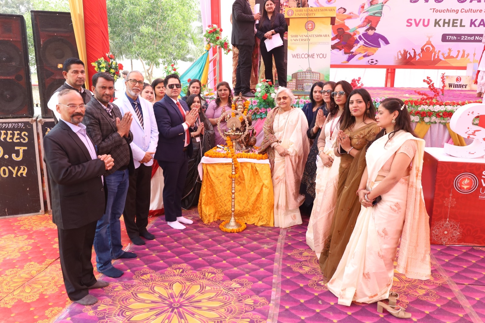 श्री वेंक्टेश्वरा विश्वविद्यालय/संस्थान के मेजर ध्यानचंद ओपन खेल परिसर में ’’खेल महाकुम्भ’’ वार्षिक स्पोर्टस मीट ’’एस0वी0यू0 ओयसिस-2025’’ के समापन समारोह को प्रतिकुलाधिपति डाॅ0 राजीव त्यागी, कुलपति प्रो0 कृष्ण कान्त दवे, कल्चर कमेटी की चेयरमैन डाॅ0 मधु चतुर्वेदी, कुलसचिव डाॅ0 पीयूष कुमार पाण्डेय आदि ने सरस्वती माँ के चित्र पर दीप प्रज्जवलित करके किया।