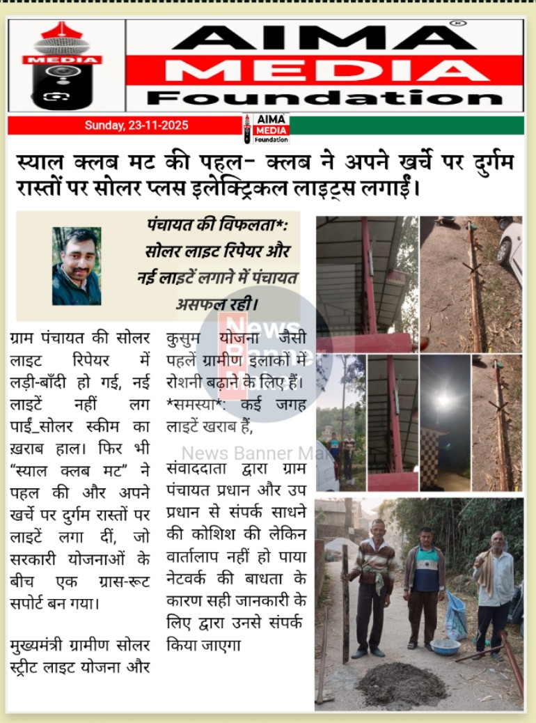 ..... स्कीम का ख़राब हाल। “स्याल क्लब मट” ने पहल की और अपने खर्चे पर दुर्गम रास्तों पर लाइटें लगा दीं, जो सरकारी योजनाओं के बीच एक ग्रास‑रूट सपोर्ट बन गया