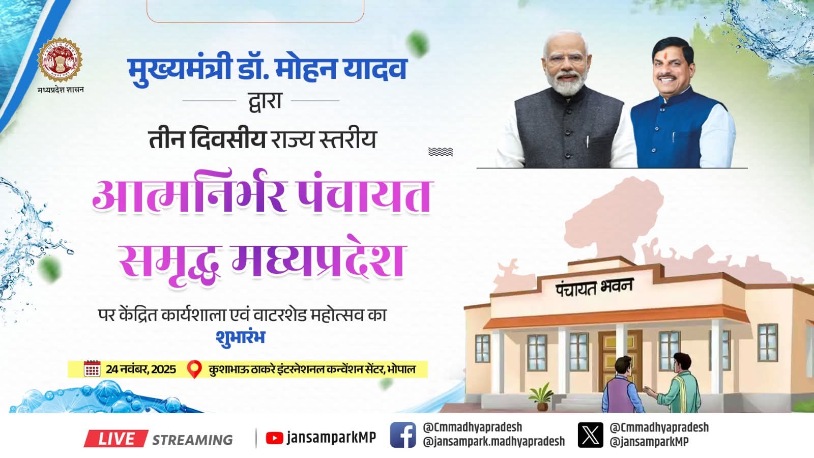 मुख्यमंत्री डॉ. मोहन यादव द्वारा तीन दिवसीय राज्य स्तरीय "आत्‍मनिर्भर पंचायत, समृद्ध मध्‍यप्रदेश'' पर केंद्रित कार्यशाला एवं वाटरशेड महोत्सव का शुभारंभ