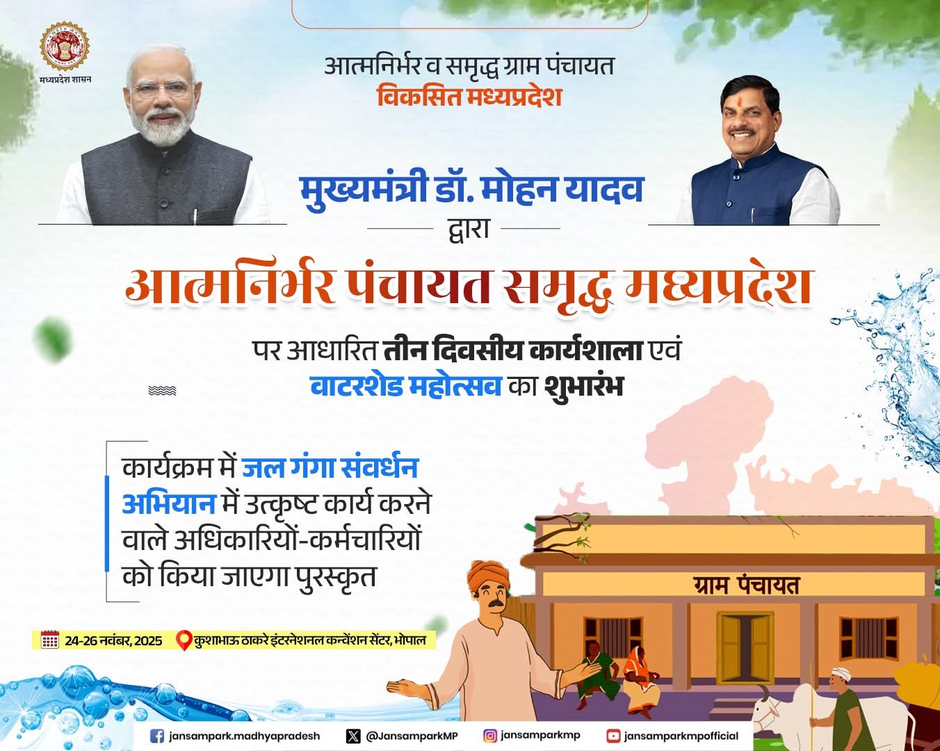 मुख्यमंत्री डॉ. मोहन यादव द्वारा “आत्मनिर्भर पंचायत समृद्ध मध्यप्रदेश” आधारित तीन दिवसीय कार्यशाला एवं वाटरशेड महोत्सव का शुभारंभ