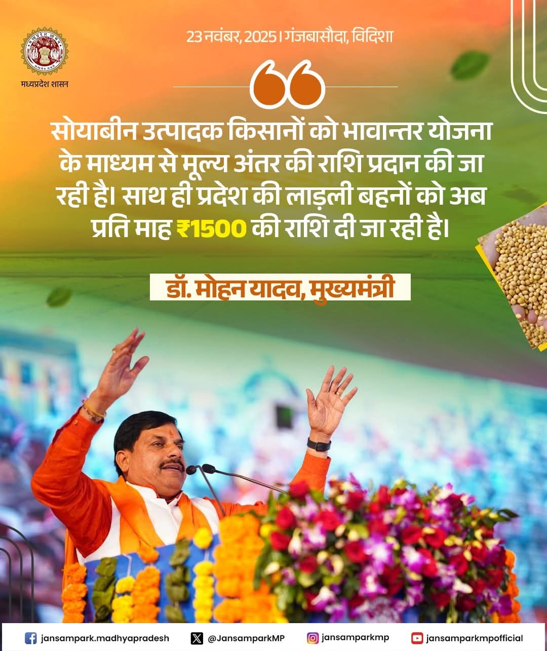 सोयाबीन उत्पादक किसानों को भावान्तर योजना के माध्यम से मूल्य अंतर की राशि प्रदान की जा रही है। साथ ही प्रदेश की लाड़ली बहनों को अब प्रति माह ₹1500 की राशि दी जा रही है।