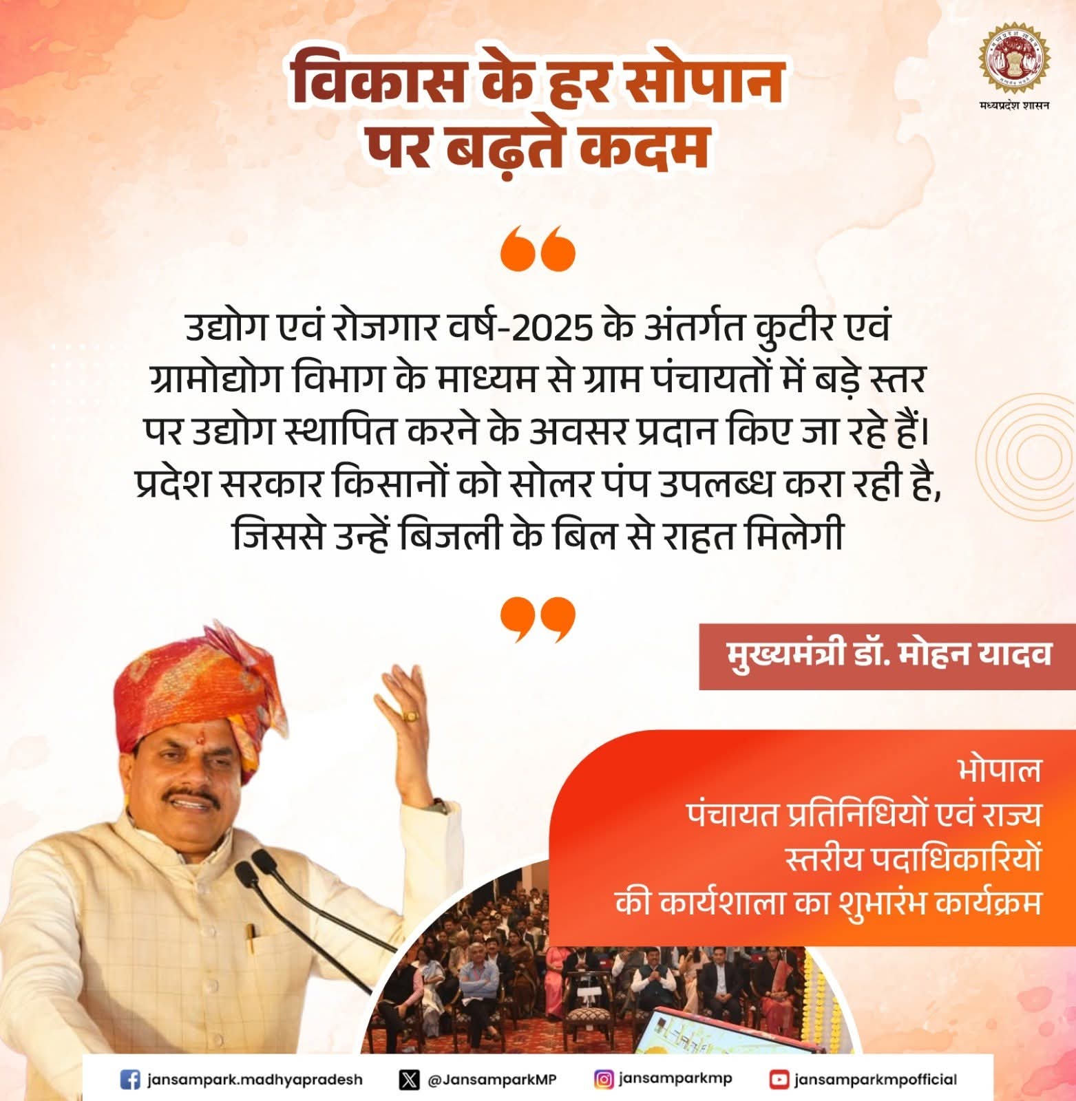 उद्योग एवं रोजगार वर्ष-2025 के अंतर्गत कुटीर एवं ग्रामोद्योग विभाग के माध्यम से ग्राम पंचायतों में बड़े स्तर पर उद्योग स्थापित करने के अवसर प्रदान किए जा रहे हैं। प्रदेश सरकार किसानों को सोलर पंप उपलब्ध करा रही है, जिससे उन्हें बिजली के बिल से राहत मिलेगी