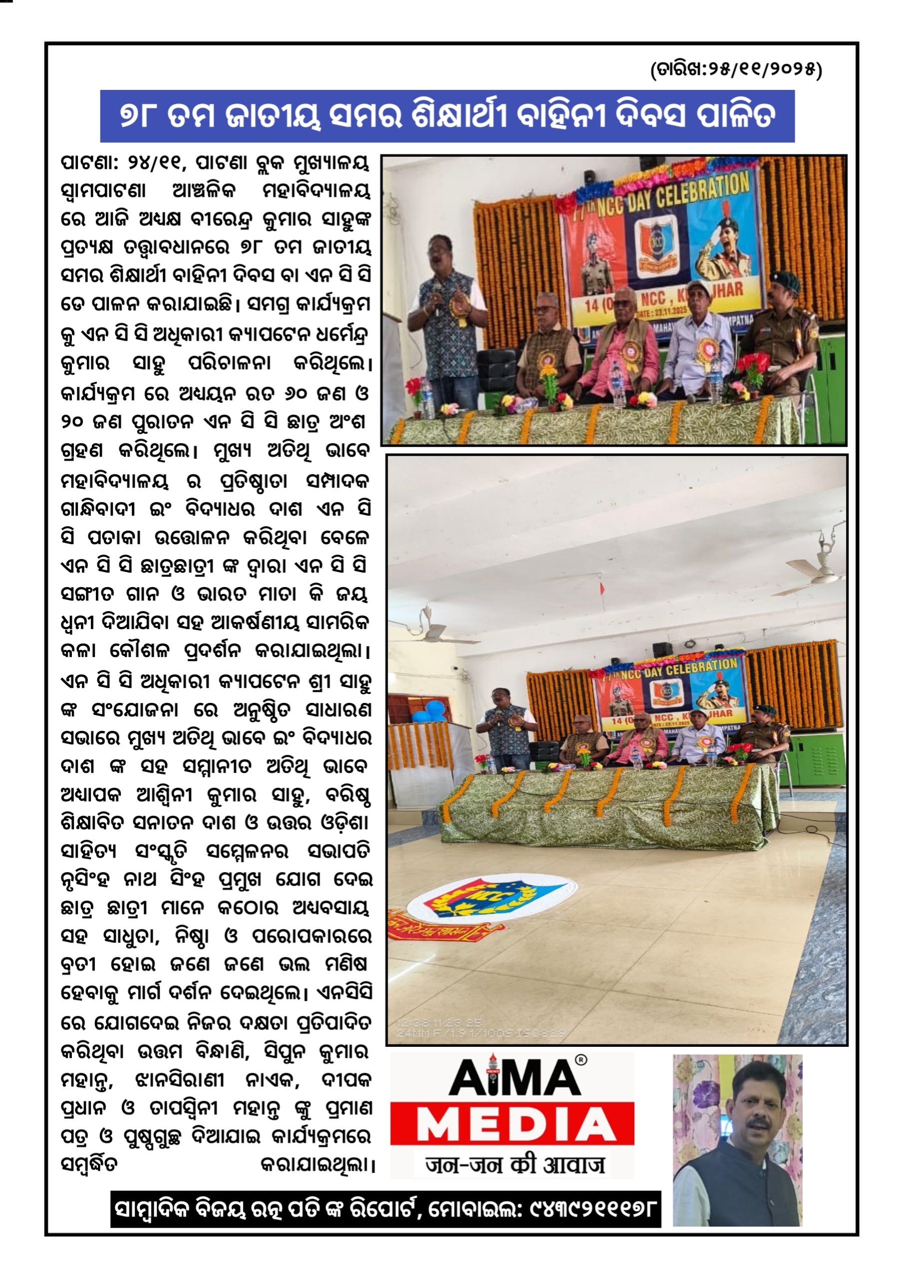 ପାଟଣା: ୨୪/୧୧, ପାଟଣା ବ୍ଲକ ମୁଖ୍ୟାଳୟ ସ୍ୱାମପାଟଣା ଆଞ୍ଚଳିକ ମହାବିଦ୍ୟାଳୟ ରେ ଆଜି ଅଧ୍ୟକ୍ଷ ବୀରେନ୍ଦ୍ର କୁମାର ସାହୁଙ୍କ ପ୍ରତ୍ୟକ୍ଷ ତତ୍ତ୍ୱାବଧାନରେ ୭୮ ତମ ଜାତୀୟ ସମର ଶିକ୍ଷାର୍ଥୀ ବାହିନୀ ଦିବସ ବା ଏନ ସି ସି ଡେ ପାଳନ କରାଯାଇଛି। ସମଗ୍ର କାର୍ଯ୍ୟକ୍ରମ କୁ ଏନ ସି ସି ଅଧିକାରୀ କ୍ୟାପଟେନ ଧର୍ମେନ୍ଦ୍ର କୁମାର ସାହୁ ପରିଚାଳନା କରିଥିଲେ। କାର୍ଯ୍ୟକ୍ରମ ରେ ଅଧ୍ୟୟନ ରତ ୬୦ ଜଣ ଓ ୨୦ ଜଣ ପୁରାତନ ଏନ ସି ସି ଛାତ୍ର ଅଂଶ ଗ୍ରହଣ କରିଥିଲେ। ମୁଖ୍ୟ ଅତିଥି ଭାବେ ମହାବିଦ୍ୟାଳୟ ର ପ୍ରତିଷ୍ଠାତା ସମ୍ପାଦକ ଗାନ୍ଧିବାଦୀ ଇଂ ବିଦ୍ୟାଧର ଦାଶ ଏନ ସି ସି ପତାକା ଉତ୍ତୋଳନ କରିଥିବା ବେଳେ ଏନ ସି ସି ଛାତ୍ରଛାତ୍ରୀ ଙ୍କ ଦ୍ଵାରା ଏନ ସି ସି ସଙ୍ଗୀତ ଗାନ ଓ ଭାରତ ମାତା କି ଜୟ ଧ୍ୱନୀ ଦିଆଯିବା ସହ ଆକର୍ଷଣୀୟ ସାମରିକ କଳା କୌଶଳ ପ୍ରଦର୍ଶନ କରାଯାଇଥିଲା। ଏନ ସି ସି ଅଧିକାରୀ କ୍ୟାପଟେନ ଶ୍ରୀ ସାହୁ ଙ୍କ ସଂଯୋଜନା ରେ ଅନୁଷ୍ଠିତ ସାଧାରଣ ସଭାରେ ମୁଖ୍ୟ ଅତିଥି ଭାବେ ଇଂ ବିଦ୍ୟାଧର ଦାଶ ଙ୍କ ସହ ସମ୍ମାନୀତ ଅତିଥି ଭାବେ ଅଧ୍ୟାପକ ଆଶ୍ୱିନୀ କୁମାର ସାହୁ, ବରିଷ୍ଠ ଶିକ୍ଷାବିତ ସନାତନ ଦାଶ ଓ ଉତ୍ତର ଓଡ଼ିଶା ସାହିତ୍ୟ ସଂସ୍କୃତି ସମ୍ମେଳନର ସଭାପତି ନୃସିଂହ ନାଥ ସିଂହ ପ୍ରମୁଖ ଯୋଗ ଦେଇ ଛାତ୍ରଛାତ୍ରୀ ମାନେ କଠୋର ଅଧ୍ୟବସାୟ ସହ ସାଧୁତା, ନିଷ୍ଠା ଓ ପରୋପକାର ରେ ବ୍ରତୀ ହୋଇ ଜଣେ ଜଣେ ଭଲ ମଣିଷ ହେବାକୁ ମାର୍ଗ ଦର୍ଶନ ଦେଇଥିଲେ। ଏନସିସି ରେ ଯୋଗଦେଇ ନିଜର ଦକ୍ଷତା ପ୍ରତିପାଦିତ କରିଥିବା ଉତ୍ତମ ବିନ୍ଧାଣି, ସିପୁନ କୁମାର ମହାନ୍ତ, ଝାନସିରାଣୀ ନାଏକ, ଦୀପକ ପ୍ରଧାନ ଓ ତାପସ୍ୱିନୀ ମହାନ୍ତ ଙ୍କୁ ପ୍ରମାଣ ପତ୍ର ଓ ପୁଷ୍ପଗୁଚ୍ଛ ଦିଆଯାଇ କାର୍ଯ୍ୟକ୍ରମରେ ସମ୍ବର୍ଦ୍ଧିତ କରାଯାଇଥିଲା।
