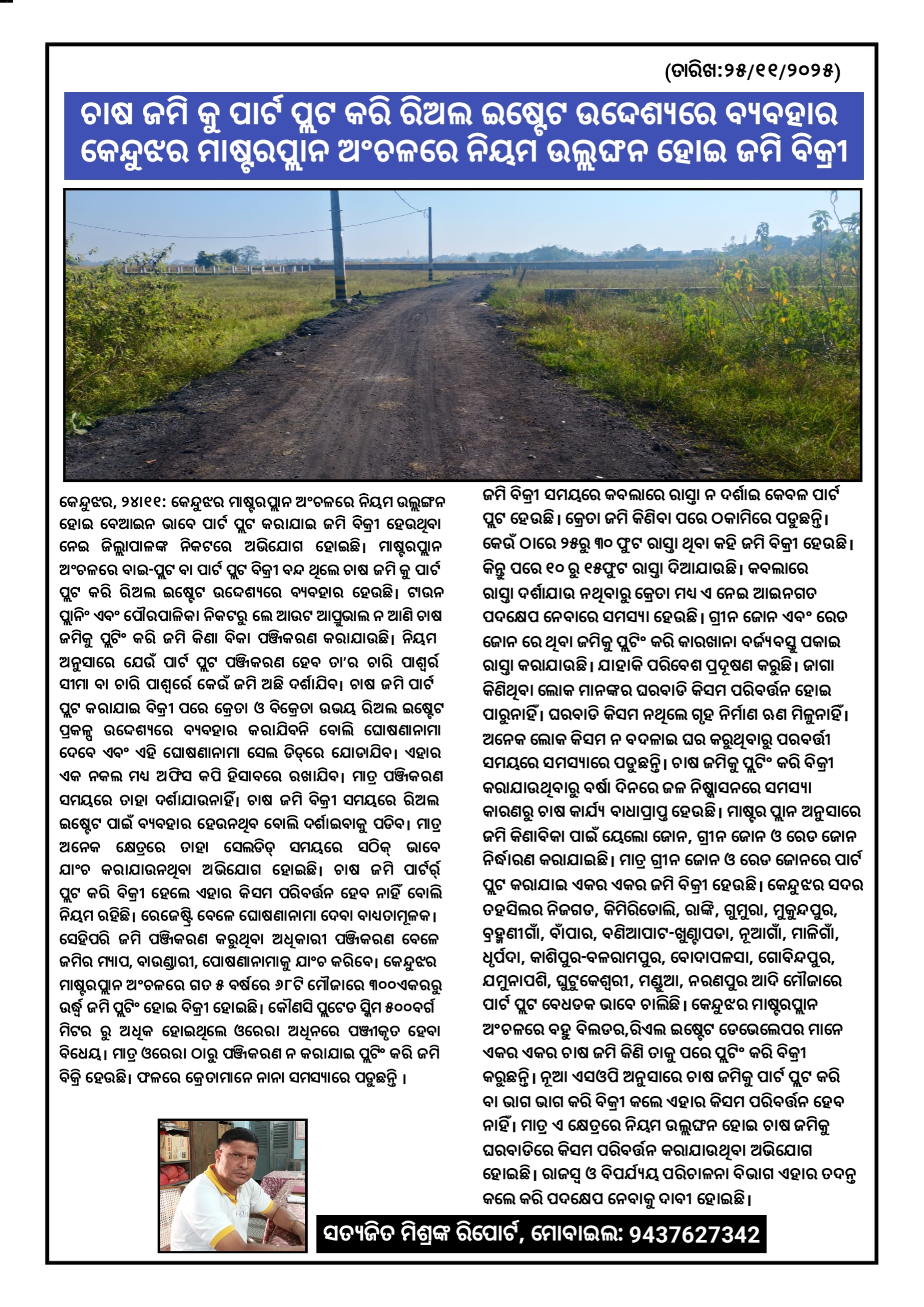 କେନ୍ଦୁଝର ମାଷ୍ଟରପ୍ଲାନ ଅଂଚଳରେ ନିୟମ ଉଲ୍ଲଙ୍ଘନ ହୋଇ ଜମି ବିକ୍ରୀ।