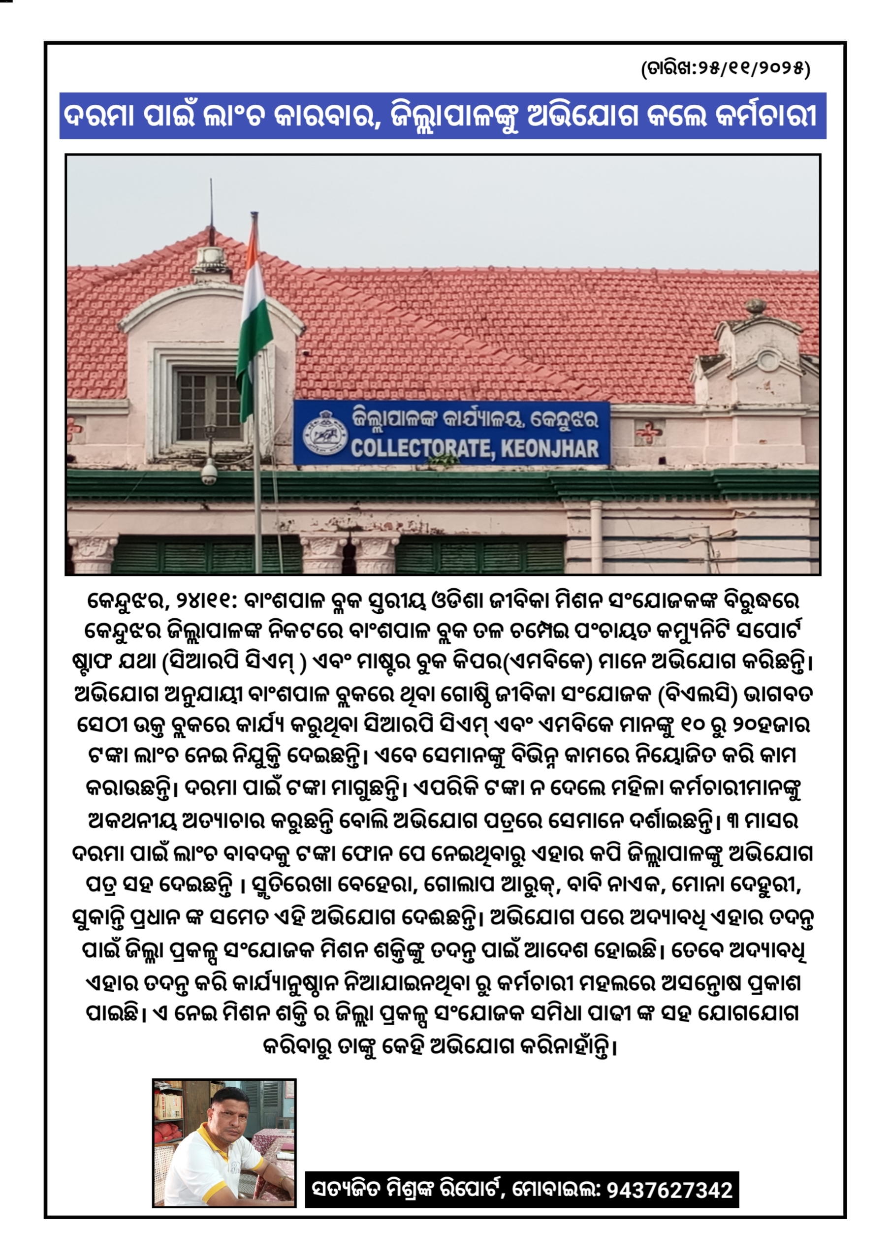 କେନ୍ଦୁଝର, ୨୪ା୧୧: ବାଂଶପାଳ ବ୍ଳକ ସ୍ତରୀୟ ଓଡିଶା ଜୀବିକା ମିଶନ ସଂଯୋଜକଙ୍କ ବିରୁଦ୍ଧରେ କେନ୍ଦୁଝର ଜିଲ୍ଲାପାଳଙ୍କ ନିକଟରେ ବାଂଶପାଳ ବ୍ଲକ ତଳ ଚମ୍ପେଇ ପଂଚାୟତ କମ୍ୟୁନିଟି ସପୋର୍ଟ ଷ୍ଟାଫ ଯଥା (ସିଆରପି ସିଏମ୍ ) ଏବଂ ମାଷ୍ଟର ବୁକ କିପର(ଏମବିକେ) ମାନେ ଅଭିଯୋଗ କରିଛନ୍ତି। ଅଭିଯୋଗ ଅନୁଯାୟୀ ବାଂଶପାଳ ବ୍ଲକରେ ଥିବା ଗୋଷ୍ଠି ଜୀବିକା ସଂଯୋଜକ (ବିଏଲସି) ଭାଗବତ ସେଠୀ ଉକ୍ତ ବ୍ଲକରେ କାର୍ଯ୍ୟ କରୁଥିବା ସିଆରପି ସିଏମ୍ ଏବଂ ଏମବିକେ ମାନଙ୍କୁ ୧୦ ରୁ ୨୦ହଜାର ଟଙ୍କା ଲାଂଚ ନେଇ ନିଯୁକ୍ତି ଦେଇଛନ୍ତି। ଏବେ ସେମାନଙ୍କୁ ବିଭିନ୍ନ କାମରେ ନିୟୋଜିତ କରି କାମ କରାଉଛନ୍ତି। ଦରମା ପାଇଁ ଟଙ୍କା ମାଗୁଛନ୍ତି। ଏପରିକି ଟଙ୍କା ନ ଦେଲେ ମହିଳା କର୍ମଚାରୀମାନଙ୍କୁ ଅକଥନୀୟ ଅତ୍ୟାଚାର କରୁଛନ୍ତି ବୋଲି ଅଭିଯୋଗପତ୍ରରେ ସେମାନେ ଦର୍ଶାଇଛନ୍ତି। ୩ ମାସର ଦରମା ପାଇଁ ଲାଂଚ ବାବଦକୁ ଟଙ୍କା ଫୋନ ପେ ନେଇଥିବାରୁ ଏହାର କପି ଜିଲ୍ଲାପାଳଙ୍କୁ ଅଭିଯୋଗ ପତ୍ର ସହ ଦେଇଛନ୍ତି। ସ୍ମୃତିରେଖା ବେହେରା, ଗୋଲାପ ଆରୁକ୍‌, ବାବି ନାଏକ, ମୋନା ଦେହୁରୀ, ସୁକାନ୍ତି ପ୍ରଧାନ ଙ୍କ ସମେତ ଏହି ଅଭିଯୋଗ ଦେଈଛନ୍ତି। ଅଭିଯୋଗ ପରେ ଅଦ୍ୟାବଧି ଏହାର ତଦନ୍ତ ପାଇଁ ଜିଲ୍ଳା ପ୍ରକଳ୍ପ ସଂଯୋଜକ ମିଶନ ଶକ୍ତିଙ୍କୁ ତଦନ୍ତ ପାଇଁ ଆଦେଶ ହୋଇଛି। ତେବେ ଅଦ୍ୟାବଧି ଏହାର ତଦନ୍ତ କରି କାର୍ଯ୍ୟାନୁଷ୍ଠାନ ନିଆଯାଇନଥିବା ରୁ କର୍ମଚାରୀ ମହଲରେ ଅସନ୍ତୋଷ ପ୍ରକାଶ ପାଇଛି। ଏ ନେଇ ମିଶନ ଶକ୍ତି ର ଜିଲ୍ଲା ପ୍ରକଳ୍ପ ସଂଯୋଜକ ସମିଧା ପାଢୀ ଙ୍କ ସହ ଯୋଗଯୋଗ କରିବାରୁ ତାଙ୍କୁ କେହି ଅଭିଯୋଗ କରିନାହାଁନ୍ତି।