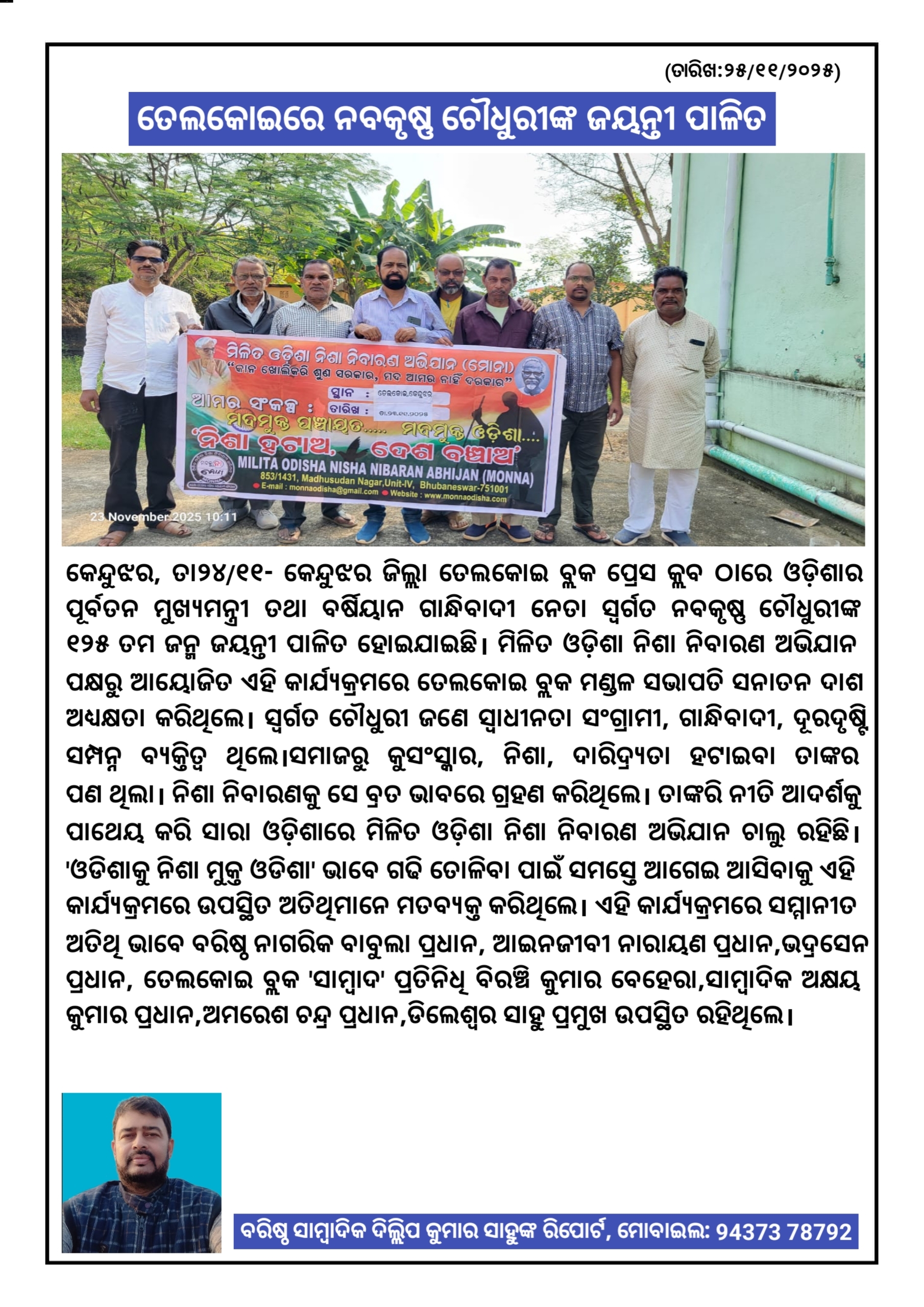 କେନ୍ଦୁଝର, ତା୨୪/୧୧- କେନ୍ଦୁଝର ଜିଲ୍ଲା ତେଲକୋଇ ବ୍ଲକ ପ୍ରେସ କ୍ଲବ ଠାରେ ଓଡ଼ିଶାର ପୂର୍ବତନ ମୁଖ୍ୟମନ୍ତ୍ରୀ ତଥା ବର୍ଷିୟାନ ଗାନ୍ଧିବାଦୀ ନେତା ସ୍ବର୍ଗତ ନବକୃଷ୍ଣ ଚୌଧୁରୀଙ୍କ ୧୨୫ ତମ ଜନ୍ମ ଜୟନ୍ତୀ ପାଳିତ ହୋଇଯାଇଛି। ମିଳିତ ଓଡ଼ିଶା ନିଶା ନିବାରଣ ଅଭିଯାନ ପକ୍ଷରୁ ଆୟୋଜିତ ଏହି କାର୍ଯ୍ୟକ୍ରମରେ ତେଲକୋଇ ବ୍ଲକ ମଣ୍ଡଳ ସଭାପତି ସନାତନ ଦାଶ ଅଧ୍ୟକ୍ଷତା କରିଥିଲେ। ସ୍ବର୍ଗତ ଚୌଧୁରୀ ଜଣେ ସ୍ୱାଧୀନତା ସଂଗ୍ରାମୀ, ଗାନ୍ଧିବାଦୀ, ଦୂରଦୃଷ୍ଟି ସମ୍ପନ୍ନ ବ୍ୟକ୍ତିତ୍ଵ ଥିଲେ। ସମାଜରୁ କୁସଂସ୍କାର,ନିଶା,ଦାରିଦ୍ର୍ୟତା ହଟାଇବା ତାଙ୍କର ପଣ ଥିଲା। ନିଶା ନିବାରଣକୁ ସେ ବ୍ରତ ଭାବରେ ଗ୍ରହଣ କରିଥିଲେ। ତାଙ୍କରି ନୀତି ଆଦର୍ଶକୁ ପାଥେୟ କରି ସାରା ଓଡ଼ିଶାରେ ମିଳିତ ଓଡ଼ିଶା ନିଶା ନିବାରଣ ଅଭିଯାନ ଚାଲୁ ରହିଛି। 'ଓଡିଶାକୁ ନିଶା ମୁକ୍ତ ଓଡିଶା' ଭାବେ ଗଢି ତୋଳିବା ପାଇଁ ସମସ୍ତେ ଆଗେଇ ଆସିବାକୁ ଏହି କାର୍ଯ୍ୟକ୍ରମରେ ଉପସ୍ଥିତ ଅତିଥିମାନେ ମତବ୍ୟକ୍ତ କରିଥିଲେ। ଏହି କାର୍ଯ୍ୟକ୍ରମରେ ସମ୍ମାନୀତ ଅତିଥି ଭାବେ ବରିଷ୍ଠ ନାଗରିକ ବାବୁଲା ପ୍ରଧାନ, ଆଇନଜୀବୀ ନାରାୟଣ ପ୍ରଧାନ, ଭଦ୍ରସେନ ପ୍ରଧାନ, ତେଲକୋଇ ବ୍ଲକ 'ସାମ୍ବାଦ' ପ୍ରତିନିଧି ବିରଞ୍ଚି କୁମାର ବେହେରା, ସାମ୍ବାଦିକ ଅକ୍ଷୟ କୁମାର ପ୍ରଧାନ,ଅମରେଶ ଚନ୍ଦ୍ର ପ୍ରଧାନ, ଡିଲେଶ୍ବର ସାହୁ ପ୍ରମୁଖ ଉପସ୍ଥିତ ରହିଥିଲେ।