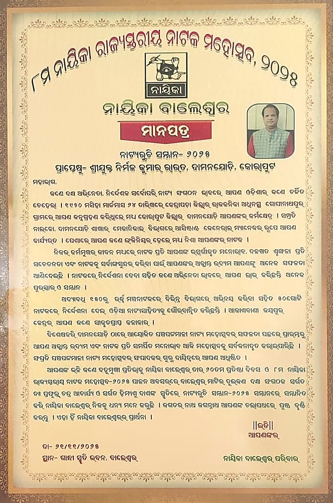 ଦାମନଯୋଡ଼ି,୨୫/୧୧:ଓଡ଼ିଶାର ଅଗ୍ରଣୀ ନାଟ୍ୟସଂସ୍ଥା 'ନାୟିକା' ଦ୍ୱାରା ବାଲେଶ୍ଵରରେ ନଭେମ୍ବର ୧୯ ରୁ ୨୨ ତାରିଖ ପର୍ଯ୍ୟନ୍ତ ଆୟୋଜିତ ବିଂଶତମ ପ୍ରତିଷ୍ଠା ଦିବସ ଏବଂ ଅଷ୍ଟମ ନାୟିକା ରାଜ୍ୟସ୍ତରୀୟ ନାଟକ ମହୋତ୍ସବ ଅବସରରେ ଦାମନଯୋଡ଼ିର ପ୍ରଖ୍ୟାତ ଅଭିନେତା,ନିର୍ଦ୍ଦେଶକ ତଥା ମଞ୍ଚ ଉପସ୍ଥାପକ ନିର୍ମଳ କୁମାର ରାଉତଙ୍କୁ 'ନାଟ୍ୟରୁଚି ସମ୍ମାନ ୨୦୨୫'ରେ ସମ୍ମାନିତ କରାଯାଇଛି।ନାଲକୋରେ ସହାୟକ ମହାପ୍ରବନ୍ଧକ ଭାବେ କାର୍ଯ୍ୟରତ ନିର୍ମଳ କୁମାର ରାଉତ ଏକାଧାରରେ ଜଣେ ମଞ୍ଚ ଅଭିନେତା,ନିର୍ଦ୍ଦେଶକ,ମଞ୍ଚ ଉପସ୍ଥାପକ, ବେତାର ନାଟକ କଳାକାର,ସାହିତ୍ୟିକ ଏବଂ କଣ୍ଠଶିଳ୍ପୀ ଭାବେ ବହୁମୁଖୀ କଳାର ଅଧିକାରୀ।ସର୍ବ ଭାରତୀୟ ସ୍ତରରେ ଦାମନଯୋଡ଼ିର ଏକମାତ୍ର କଳାକାର ଭାବେ ସେ ଶ୍ରେଷ୍ଠ ଅଭିନେତାର ପୁରସ୍କାର ଲାଭ କରିଥିବା ବେଳେ ବହୁବାର ସେ ଶ୍ରେଷ୍ଠ ନିର୍ଦ୍ଦେଶକ ଏବଂ ଅଭିନେତାର ପୁରସ୍କାର ଲାଭ କରିଛନ୍ତି।ଦାମନଯୋଡ଼ିରେ ଦୀର୍ଘ ୨୦ ବର୍ଷ ଧରି ରାଜ୍ୟସ୍ତରୀୟ ନାଟ୍ୟ ମହୋତ୍ସବ ଆୟୋଜନ କରି ଆସୁଥିବା ପଞ୍ଚପଟ୍ଟମାଳୀ ନାଟ୍ୟ ମହୋତ୍ସବର ସେ ସମ୍ପାଦକ ଭାବେ ଅବସ୍ଥାପିତ।ନାଟକ ପ୍ରତି ତାଙ୍କର ନିଷ୍ଠା ଏବଂ ସମର୍ପିତ ଭାବ ଯୋଗୁଁ ସେ ପୂର୍ବରୁ ବହୁ ସମ୍ବର୍ଦ୍ଧନା ପାଇଛନ୍ତି।ବାଲେଶ୍ଵର ନାଟକ ମହୋତ୍ସବର ତୃତୀୟ ସନ୍ଧ୍ୟାରେ ୨୧ ତାରିଖ ଦିନ ଆୟୋଜିତ ଏକ ଭବ୍ୟ ସମ୍ବର୍ଦ୍ଧନା ସଭାରେ ମୁଖ୍ୟ ଅତିଥି ବାଲେଶ୍ୱରର ସୁପରିଚିତ ନାଟ୍ୟକାର ଉତ୍ତମ ଚାନ୍ଦ,ସମ୍ମାନିତ ଅତିଥି ଆଇନଜୀବି ସୁଧାଂଶୁ ଦାସ,ସାମ୍ବାଦିକା ସୁମନା ପରିଡା ଏବଂ ନାୟିକା,ବାଲେଶ୍ୱରର ନିର୍ଦ୍ଦେଶିକା ସୁସ୍ମିତା ରଣା ପ୍ରମୁଖ ପୁଷ୍ପଗୁଚ୍ଛ,ଉତ୍ତରୀୟ,ମାନପତ୍ର ଏବଂ ଫଳକ ପ୍ରଦାନ ପୂର୍ବକ ନିର୍ମଳଙ୍କୁ ସମ୍ବର୍ଦ୍ଧିତ କରିଥିଲେ।ଏହି ସମ୍ବର୍ଦ୍ଧନା ସହିତ ନିର୍ମଳ କୁମାର ରାଉତ ଓଡିଶା ନାଟ୍ୟ ସଙ୍ଘର କାର୍ଯ୍ୟ ନିର୍ବାହୀ କମିଟିର ସଦସ୍ୟ ଭାବେ ମନୋନୀତ ହୋଇ ଥିବାରୁ ସମଗ୍ର ଓଡ଼ିଶାର ନାଟ୍ୟକର୍ମୀ ମାନେ ତାଙ୍କୁ ଅଜସ୍ର ଶୁଭେଚ୍ଛା ଏବଂ ଅଭିନନ୍ଦନ ଜଣାଇଛନ୍ତି।ନାୟିକା ଦ୍ୱାରା ଆୟୋଜିତ ନାଟକ ମହୋତ୍ସବର ତୃତୀୟ ସନ୍ଧ୍ୟାରେ ପଞ୍ଚପଟ୍ଟମାଳୀ ନାଟ୍ୟ ମହୋତ୍ସବ,ଦାମନଯୋଡ଼ିର କଳାକାରମାନେ ବହୁ ଚର୍ଚ୍ଚିତ ନାଟକ କଳାମଲ୍ଲୀ ପରିବେଷଣ କରିଥିଲେ,ଯାହାକି ଓଡ଼ିଶାର ବହୁ ମଞ୍ଚରେ ଅଭିନୀତ ହୋଇ ଭରପୁର ଦର୍ଶକାଦୃତି ଲାଭ କରିଛି।ନାଟକଟିକୁ ସୁଶାନ୍ତ କୁମାର ଦାସ ରଚନା କରିଥିବାବେଳେ ଶେଷଦେବ ଶତପଥି ନିର୍ଦ୍ଦେଶନା ଦେଇଛନ୍ତି।ସମସ୍ତ କଳାକାରଙ୍କ ନିଖୁଣ ଅଭିନୟ ନାଟକଟିକୁ ସର୍ବାଙ୍ଗ ସୁନ୍ଦର କରିବା ସହ ବାଲେଶ୍ୱରର ଗାନ୍ଧୀ ସ୍ମୃତି ଭବନରେ ଦର୍ଶକଙ୍କୁ ଅଭିଭୂତ କରିଥିଲା।