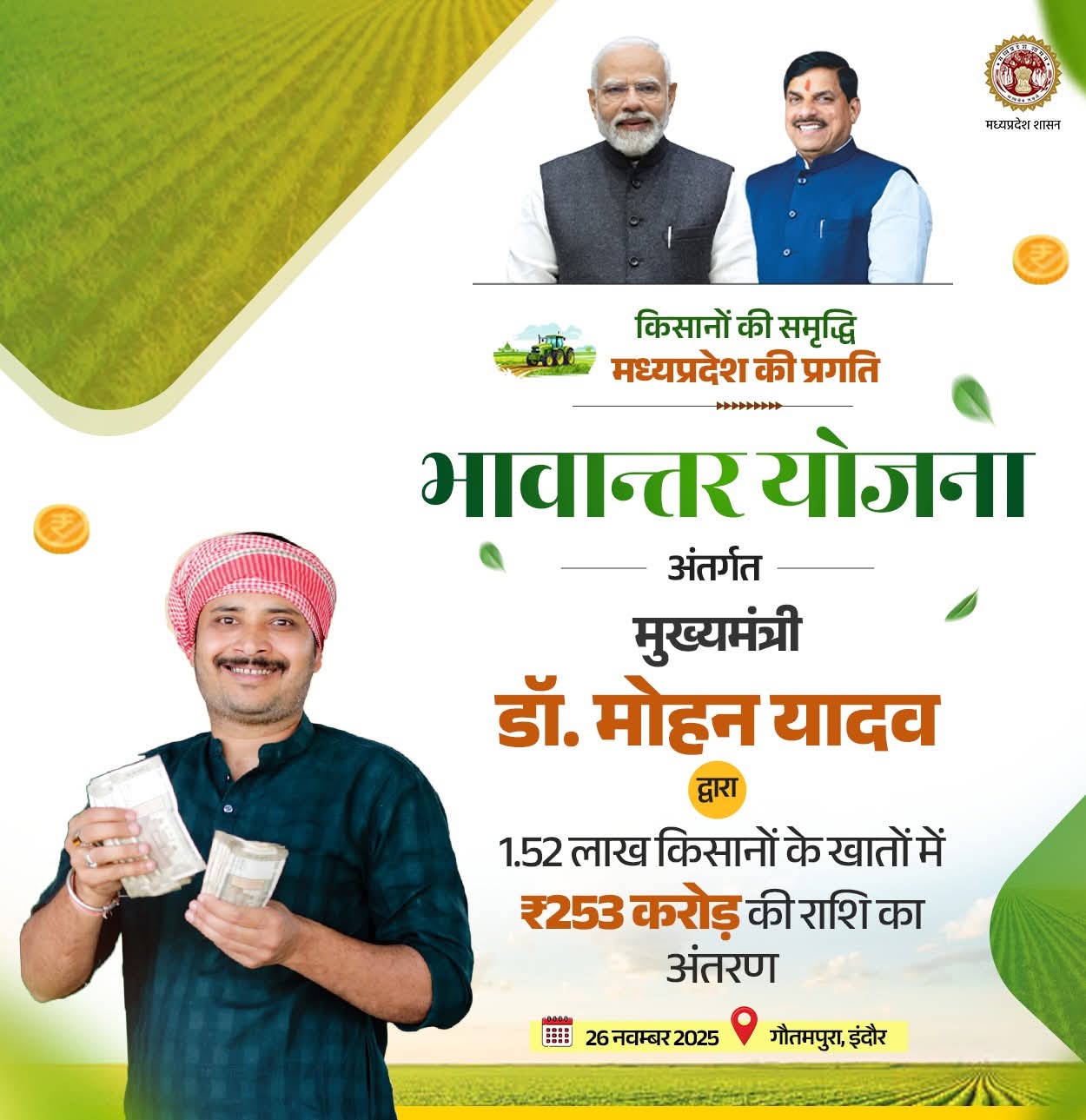 मुख्यमंत्री डॉ. मोहन यादव ₹𝟐𝟓𝟑 करोड़ की भावान्तर राशि 𝟏.𝟓𝟐 लाख किसानों के खातों में अंतरित करेंगे।