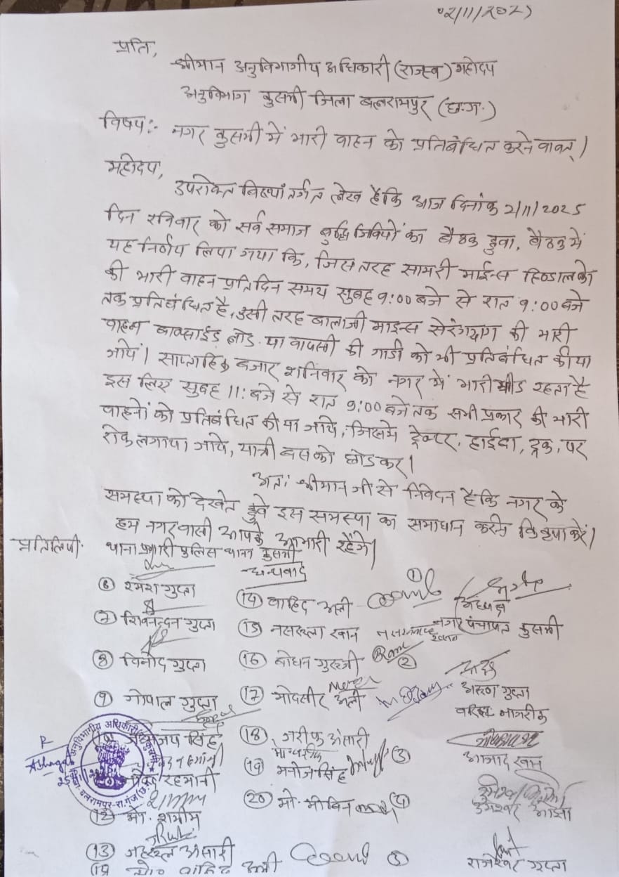 कुसमी मुख्य मार्ग पर भारी वाहनों के प्रतिबंध की मांग, सर्व समाज समिति ने एसडीएम को सौंपा ज्ञापन.!
