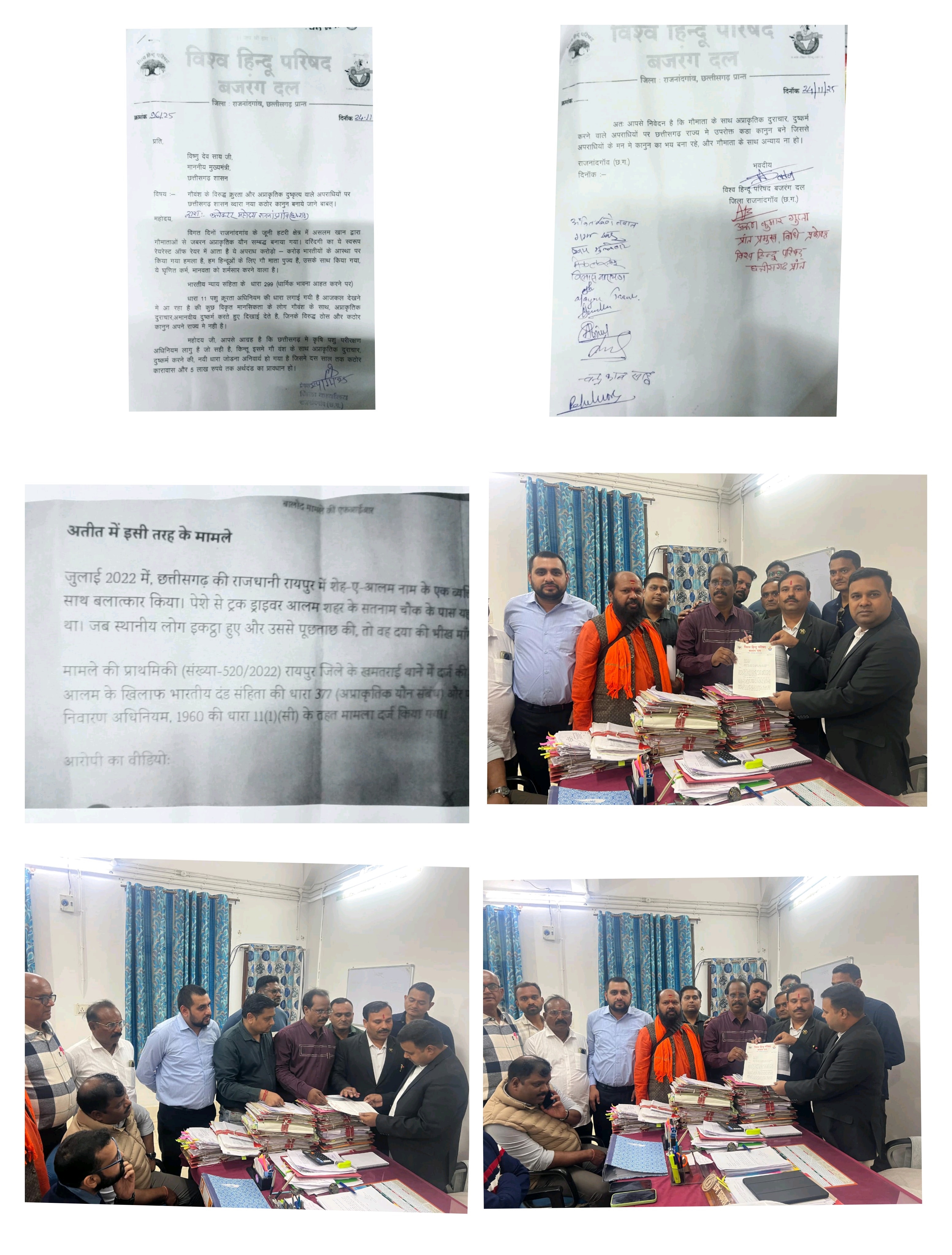 *राजनांदगांव - गौ माता के साथ दुष्कर्म और अनाचार का मामला बढ रहा है,,, आए दिन ऎसा मामला,हो रहा है,,राजनांदगांव मे भी असलम खान व्दारा दो गौमाता से दुष्कर्म किया गया,,जिसकी रिपोर्ट कोतवाली थाना राजनांदगांव मे की गयी है ऎसा ही दुष्कृत्य रायपुर मे भी, आलम नामक व्यक्ति व्दारा किया गया था,,जिस पर भी अपराध पंजीबद्ध किया गया था,, ,,किन्तु आई. पी. सी. ,, बी.एन. एस. हो या छत्तीसगढ़ पशु संरक्षण अधिनियम ,,किसी मे भी इस अपराध के लिए कोई पृथक से धारा या कानुन नही है,,,इसलिए ,विश्व हिन्दू परिषद्, बजरंग दल राजनांदगांव व्दारा मुख्यमंत्री जी के नाम ,, गौ माता के साथ दुष्कर्म करने वाले अपराध मे नयी धारा जोडी जाए,जिसमे कम से कम १० वर्ष का कठोर कारावास, और ५ लाख तक के अर्थदंड से दण्डित किया जाए,, विश्व हिन्दू परिषद्,, बजरंग दल के सभी पदाधिकारी ऎसा कानुन बनाने हेतु ,कलेक्टर महोदय रसजनांदगांव को ज्ञापन सौंपा है । इस कार्यक्रम में विहिप. के प्रांत, विभाग, जिला और नगर के सभी प्रमुख पदाधिकारीगण उपस्थित रहे*