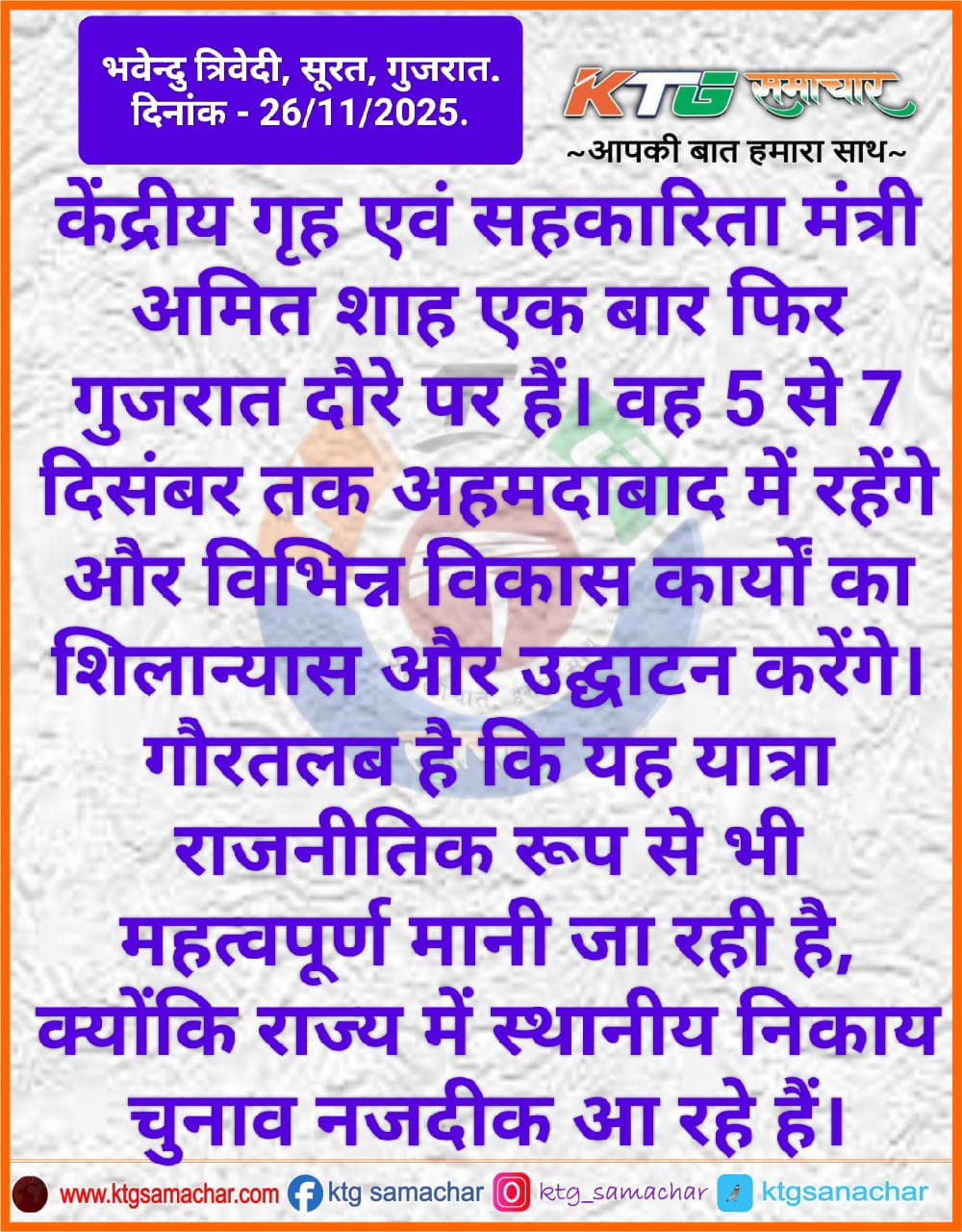 वह 5 से 7 दिसंबर तक अहमदाबाद में रहेंगे और विभिन्न विकास कार्यों का शिलान्यास और उद्घाटन करेंगे।