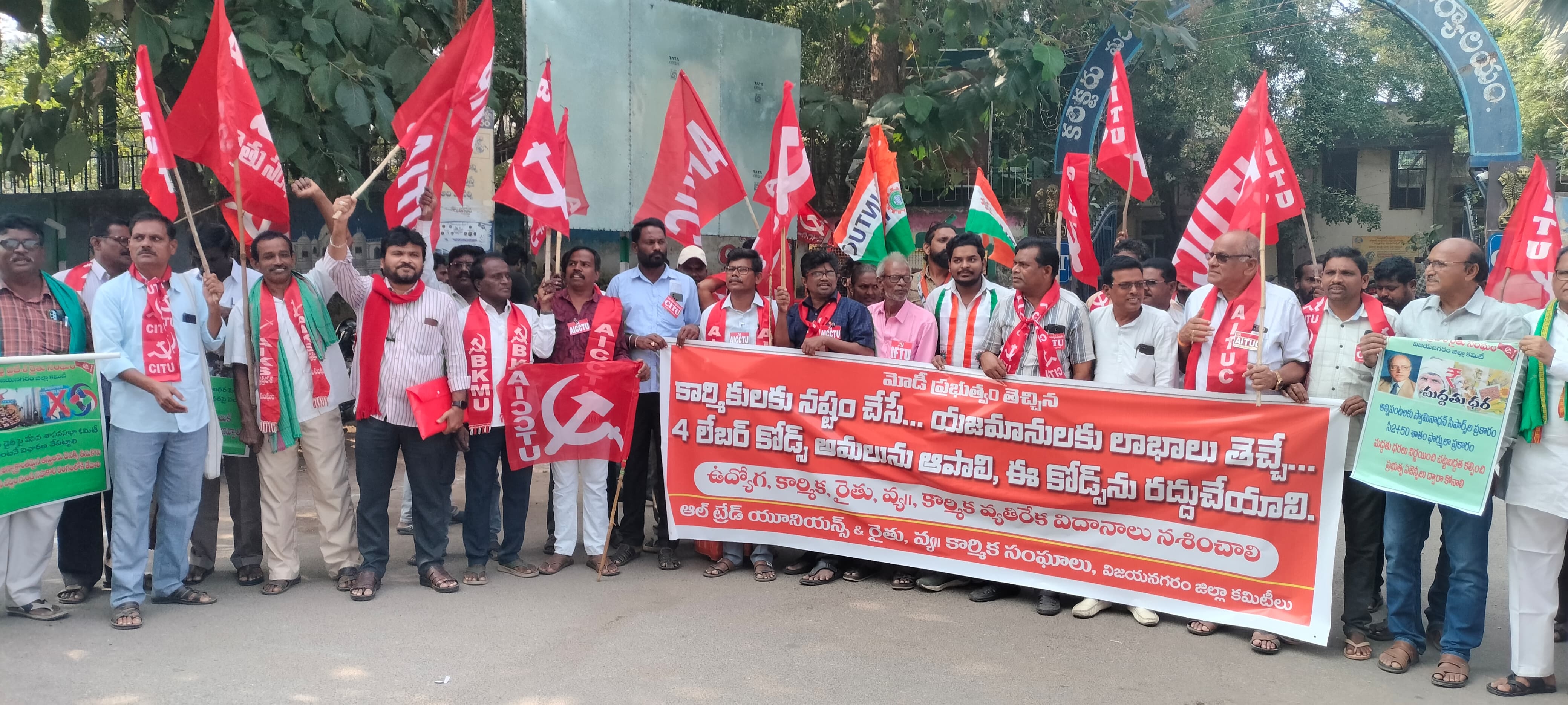 మోడీ అనుసరిస్తున్న ప్తజా, కార్మిక, రైతు, వ్యవసాయ కార్మిక వ్యతిరేక విధానాలకు వ్యతిరేకంగా, కార్పొరేట్లకు, పారిశ్రామిక పెట్టుబడిదారులకి కార్మికులను, రైతులను కట్టుబానిసలుగా చేసెందుకు మోడీ ప్రభుత్వం తీసుకోచ్చిన 4 లేబర్ కోడ్ లను, 3 రైతు నల్ల చట్టాలను రద్దు చేయాలని డిమాండ్ చేస్తూ కేంద్ర కార్మిక సంఘాలు, రైతు సంఘాలు, వ్యవసాయ కార్మిక సంఘాల ఆధ్వర్యంలో దేశవ్యాపిత నిరసన కార్యక్రమం పిలుపులో భాగంగా బుధవారం ఉదయం విజయనగరం జిల్లా కలెక్టరెట్ దగ్గర నిరసన కార్యక్రమం చేయడం జరిగింది.